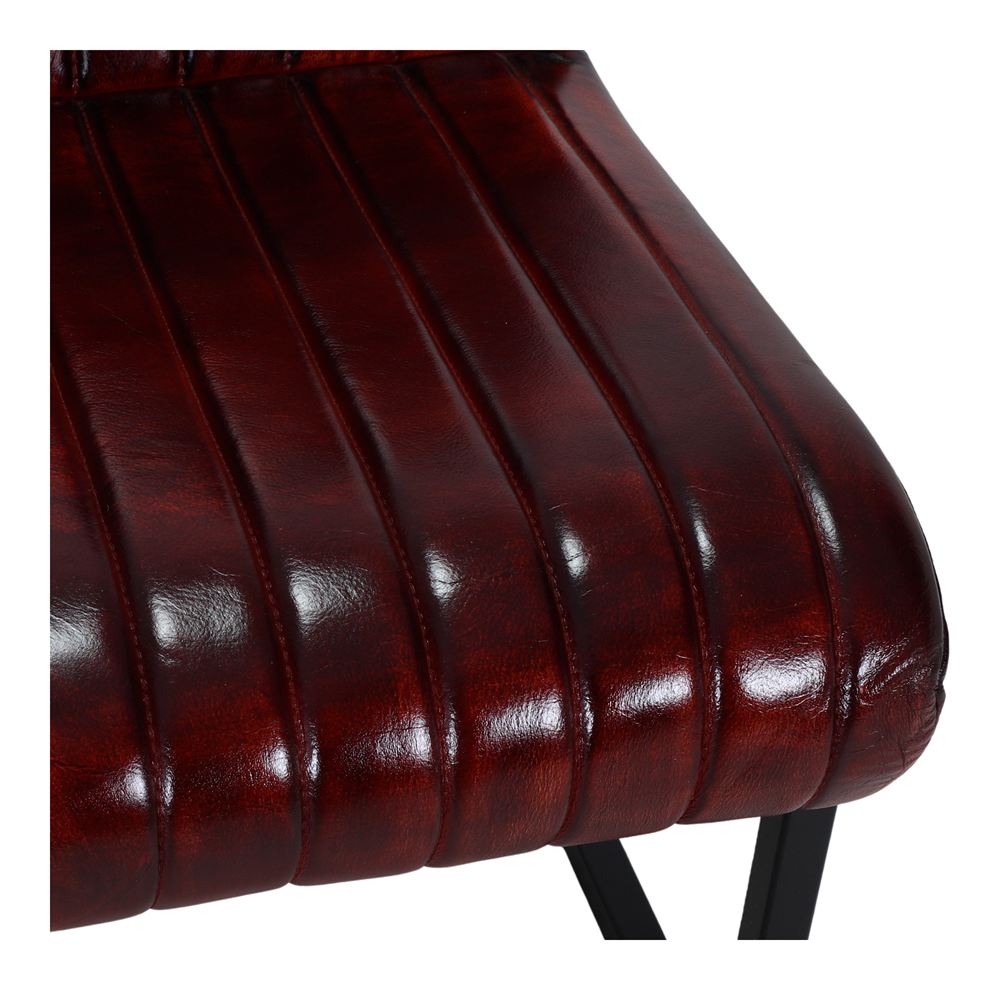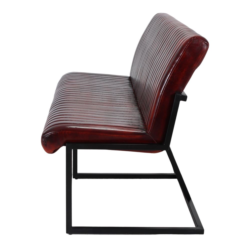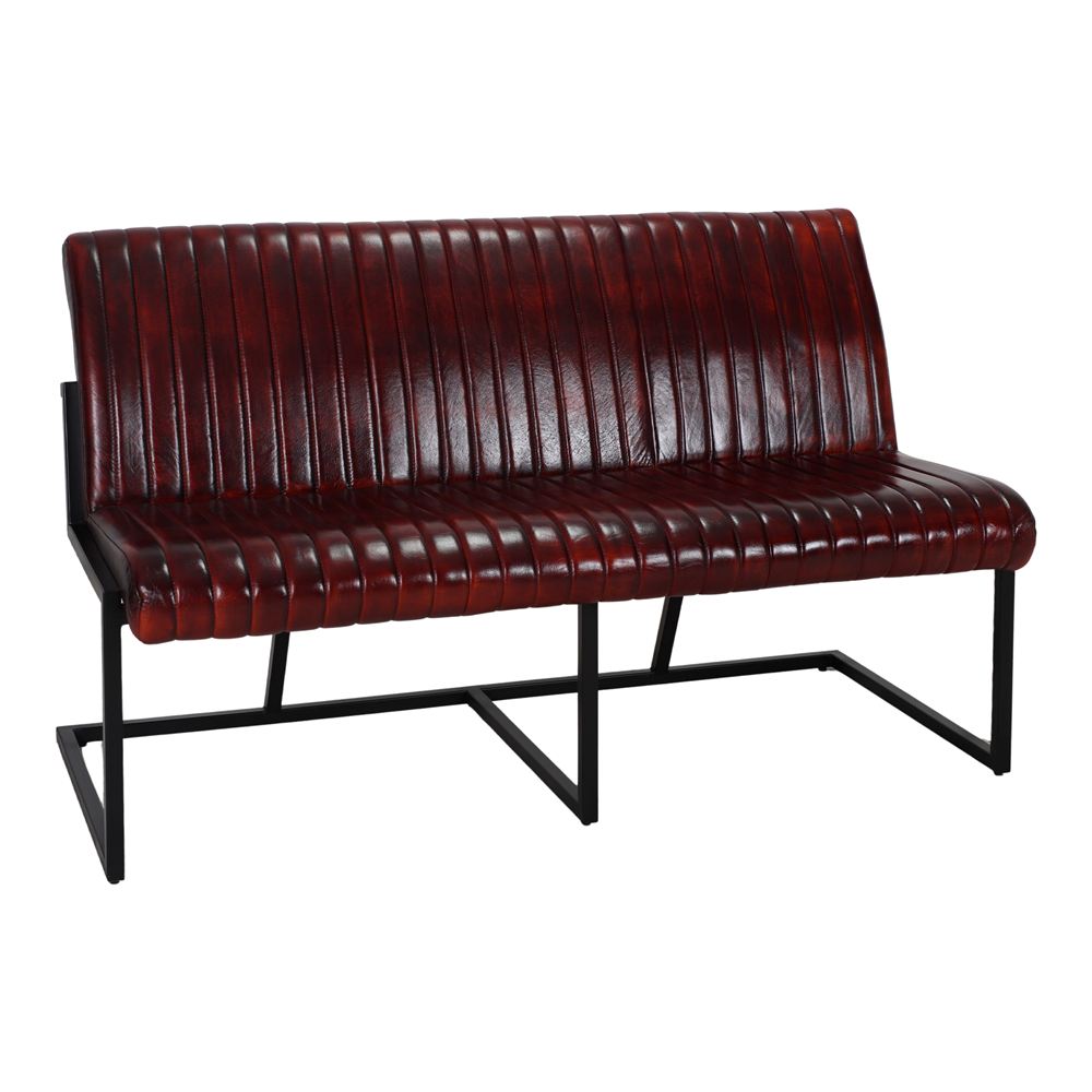Banquette de style industriel avec structure en tubes d’acier, finition peinture powder coated noire, assise et dossier en cuir.