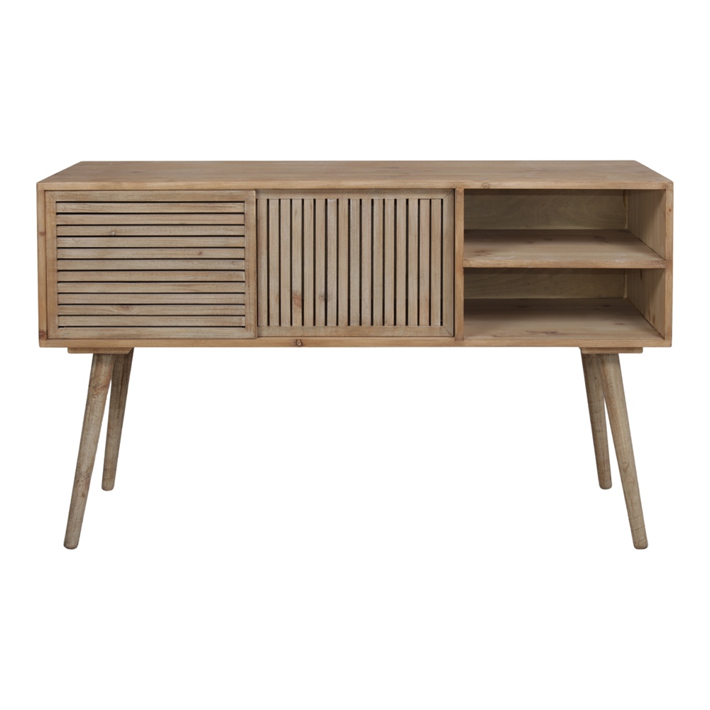 Lattes en bois de sapin, pieds en aiguille et finition naturelle. Le buffet en bois Irvin fait partie de ces meubles de salon modernes qui ont tout pour réussir, et qui s’intègrent dans n’importe quel environnement grâce à son style nordique.