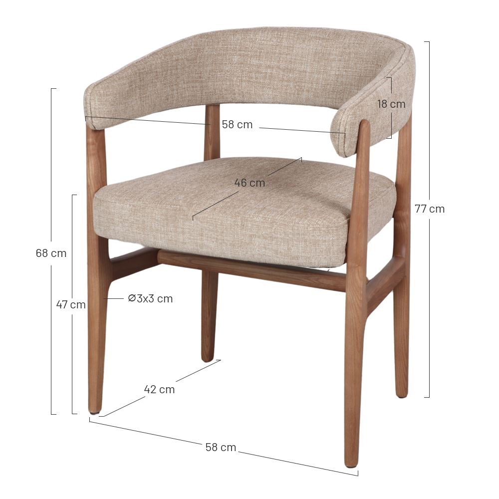 Dimensions : 58x58x77 cm | Hauteur d’assise : 47 cm | Accoudoirs : 68-75 cm