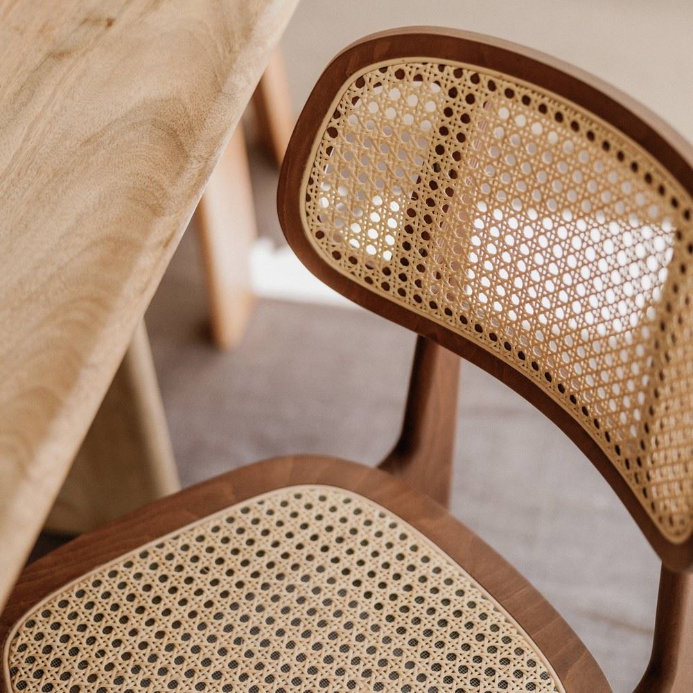 L’assise et le dossier sont réalisés en maille de fibres naturelles de type cannage, un matériau fabriqué à la main qui se distingue par sa légèreté et son esthétique intemporelle. Ce détail ajoute non seulement une touche de sophistication, mais assure également un confort grâce à sa flexibilité. La texture délicate du cannage contraste harmonieusement avec la solidité du bois, créant un équilibre visuel unique.