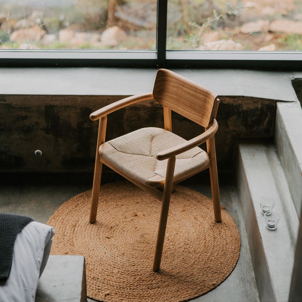 L’assise, réalisée en fibre naturelle tressée, ajoute une touche artisanale et organique qui rehausse son caractère unique. Cette combinaison de matériaux garantit non seulement un confort unique, mais offre également un joli contraste entre la texture chaleureuse du bois et le design tressé de l’assise.