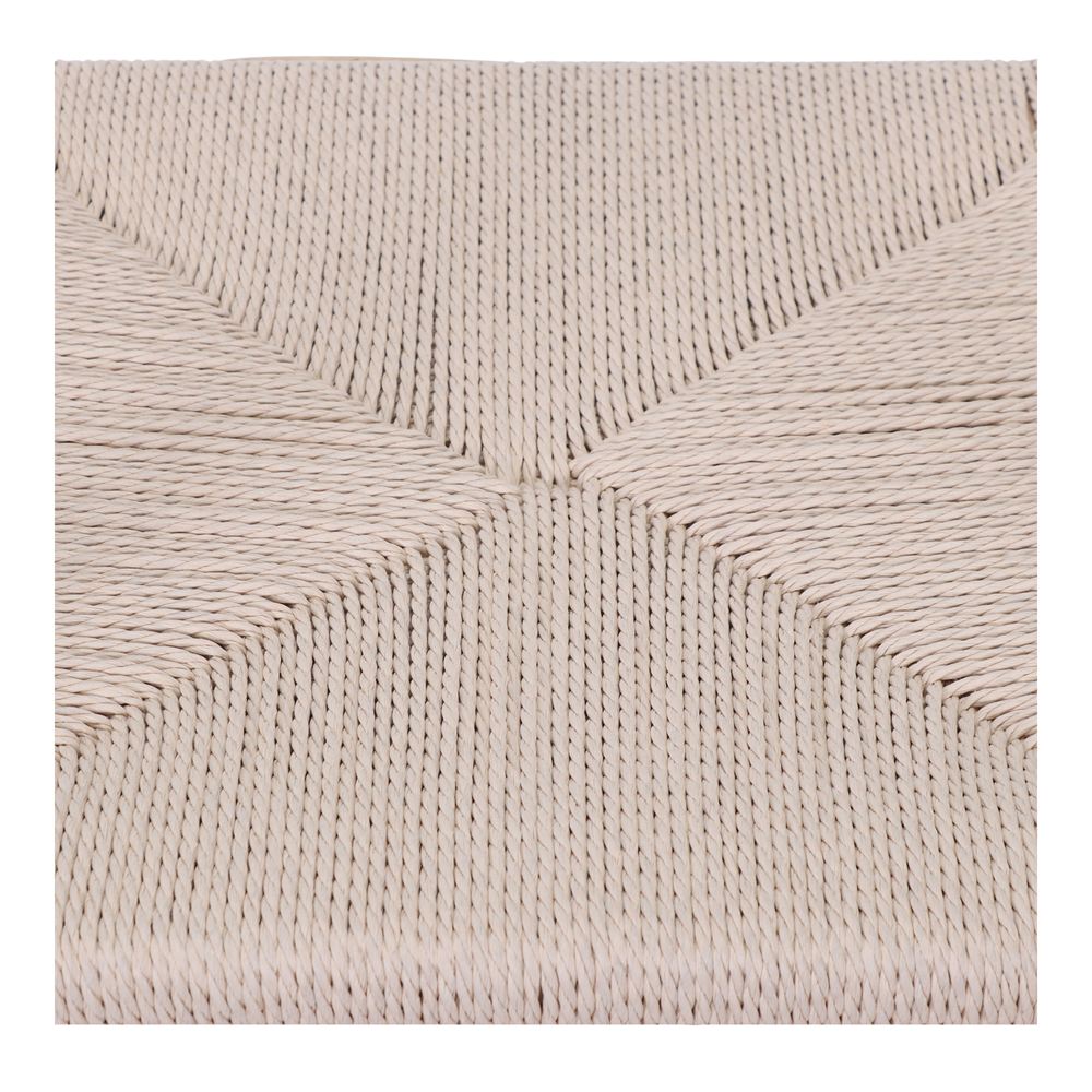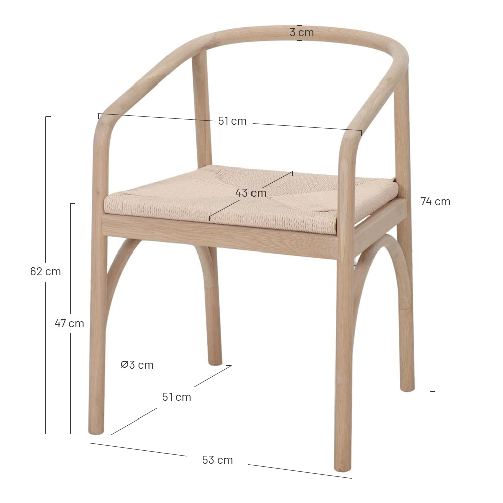 L’assise est fabriquée avec de la corde naturelle tressée à la main, apportant une touche artisanale et texturée qui complète la chaleur du bois de chêne. Cette corde ajoute non seulement un élément visuel attrayant, mais offre également une assise confortable et robuste, adaptée à un usage quotidien.