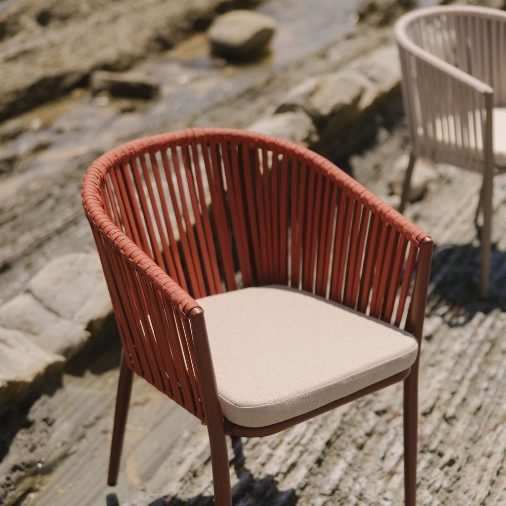 La chaise en corde Agosta a une structure en aluminium avec une finition peinture. L’assise et le dossier sont en corde de polyester. Cette chaise en corde de style contemporain est idéale pour la terrasse, et grâce à ses couleurs, elle ajoutera une touche très personnelle à votre espace. Cette chaise est également livrée avec un coussin pour un maximum de confort. À cela, nous ajoutons l’élégance, la personnalité et la légèreté grâce à ses matériaux et sa résistance, pour un modèle de chaise parfait pour un extérieur sous abri.