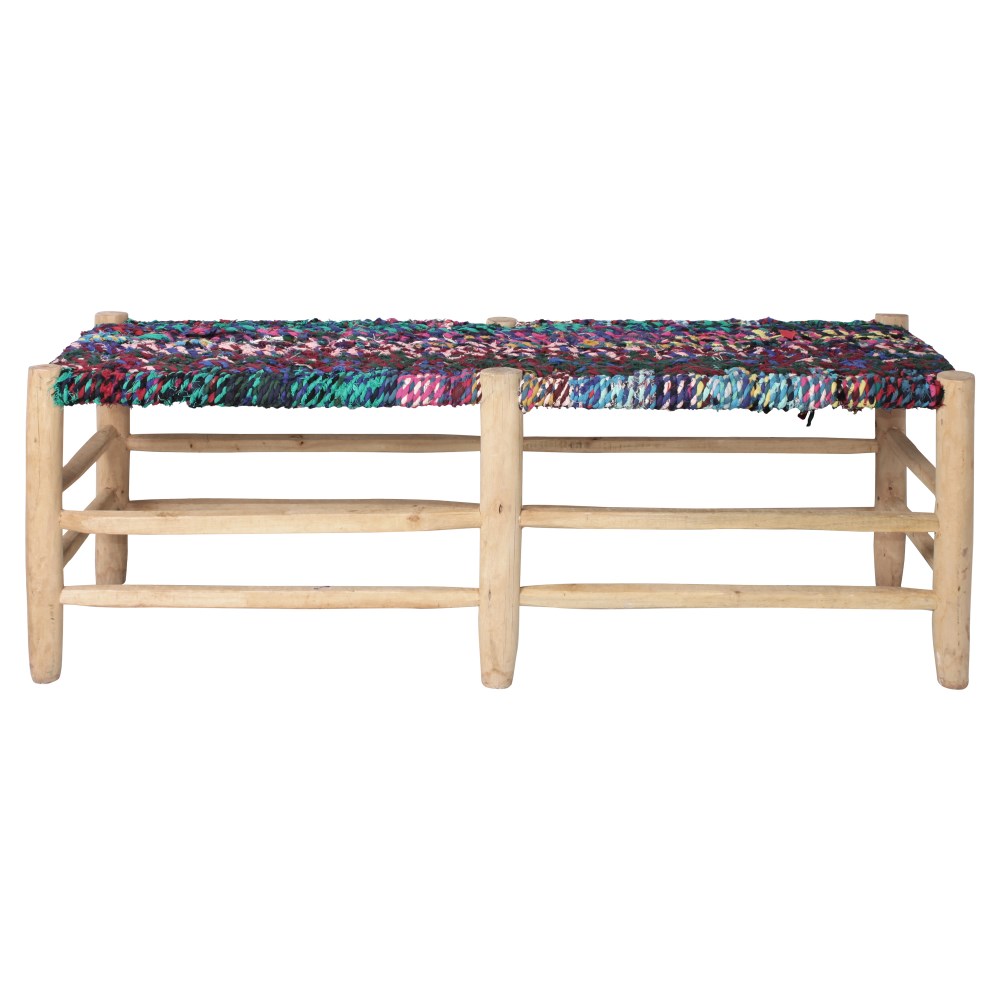 Banc de style ethnique fabriqué en bois de laurier. Assise tapissée en palmier tressé multicolore.