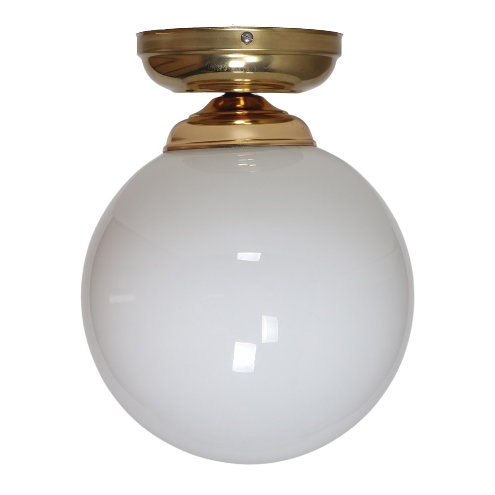 Lampe de plafond de style rétro vintage, structure en métal, finition laiton, boule en verre d’opaline.