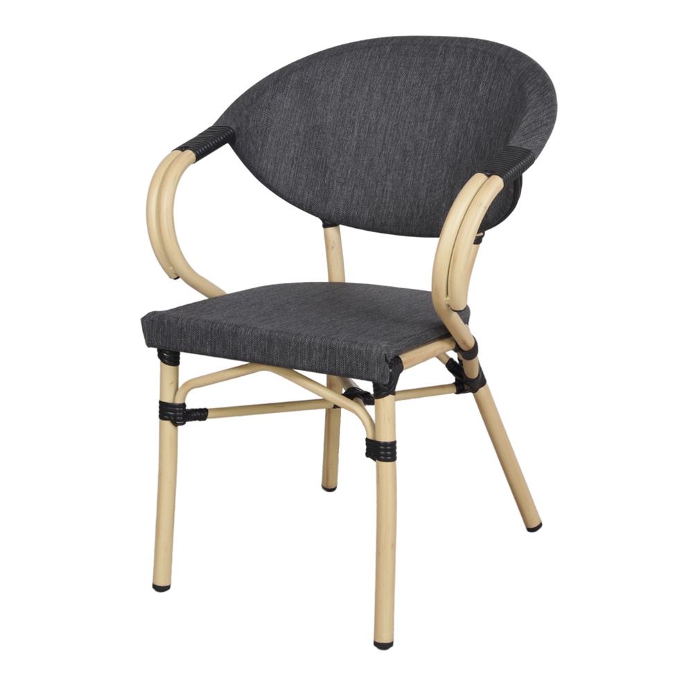 L’esthétique des chaises d’extérieur en aluminium peut être très variée, comme nous le montre la chaise d’extérieur Ambito, de style Bistro. Sa structure est en aluminium avec finition imitation bambou, et son assise et son dossier en rotin synthétique tressé. Par ailleurs, grâce à la légèreté dont nous parlions et à son design, cette chaise peut facilement être empilée.