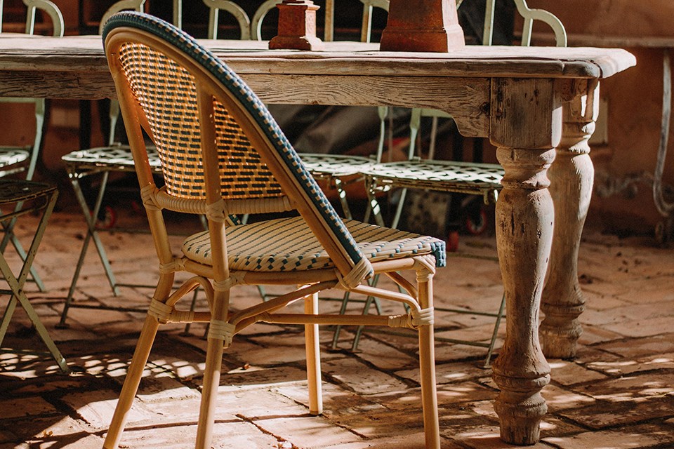 Fibres synthétiques : Bien que nous aimions les fibres naturelles, si à la mode, nous devons céder à la praticité des fibres synthétiques lorsqu’il s’agit de chaises d’extérieur. Le rotin naturel, par exemple, est un matériau léger, pratiquement incassable et facilement adaptable, mais il ne peut être utilisé pour les chaises d’extérieur que lorsqu’il a été traité contre les parasites, ainsi que recouvert d’un vernis spécial contre le soleil et l’eau. Il est toutefois recommandé de l’utiliser sous abri.