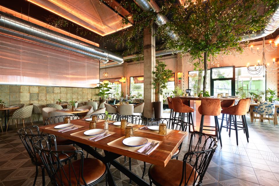 Jesús et son équipe ont été impliqués dans la conception des lieux, aidés par le studio d’architecture Cota 7. Comme toujours, en prenant soin du moindre détail, non seulement en cuisine, mais aussi dans la décoration du restaurant. Ils ont su créer un espace lumineux avec beaucoup de végétation. Les murs sont recouverts de tuiles vieillies, des lampes en métal sublimes et originales, des chaises tapissées d’imprimés floraux, des tabourets en cuir et en métal viennent renforcer la personnalité de ce bel endroit.