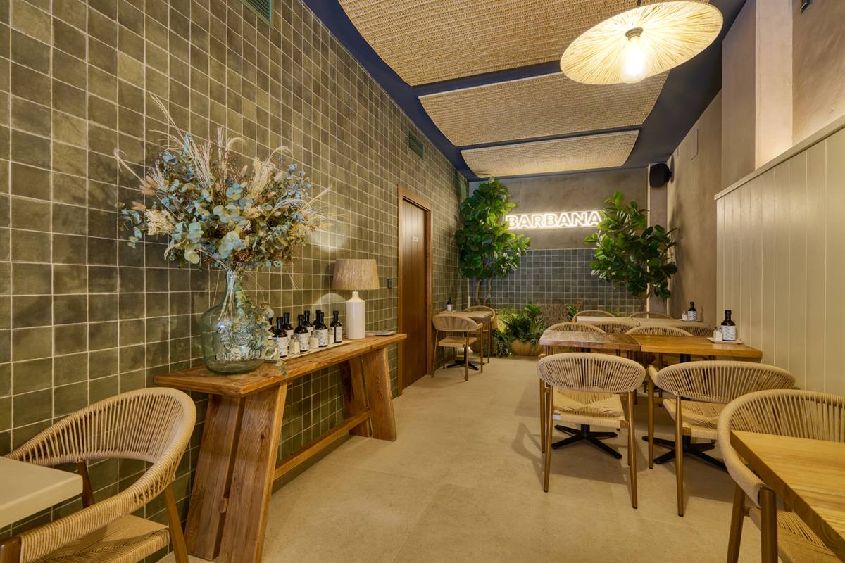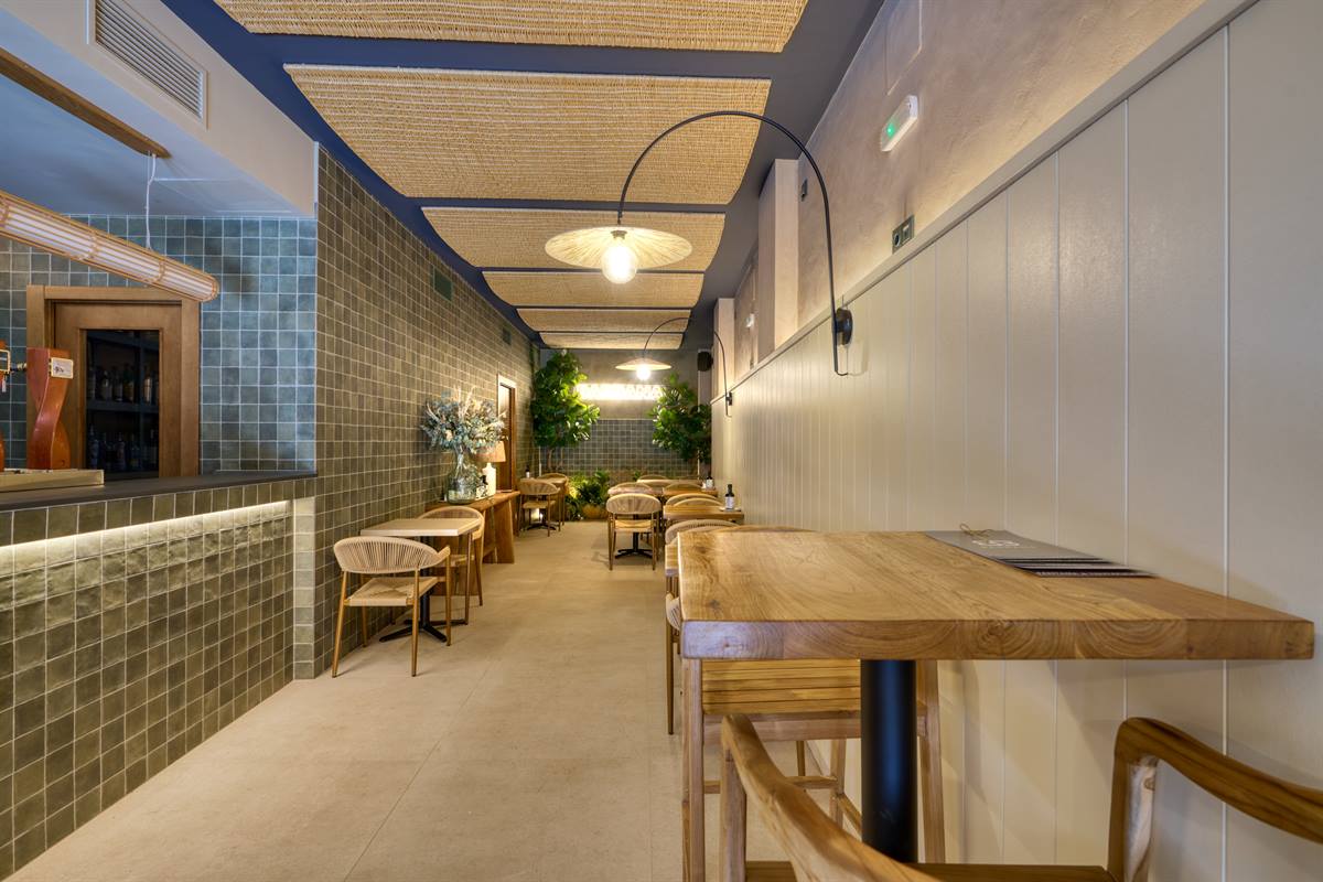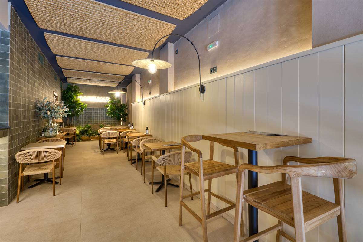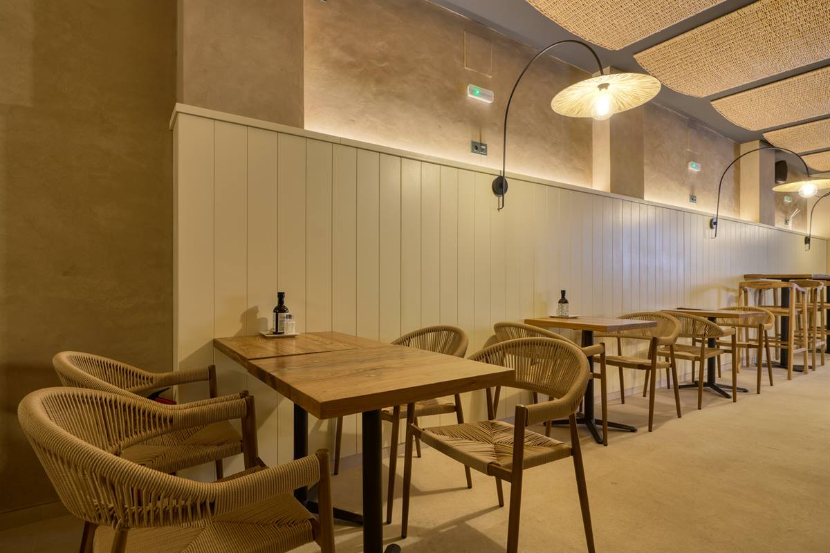 Le carrelage choisi dans les tons aigue-marine rappelle les paysages marins, et la peinture à la chaux sur les murs apporte fraîcheur et tradition. Sans oublier les plafonniers en osier qui enveloppent l’atmosphère de chaleur, les frises en bois et les sols en porcelaine de haute résistance et d’esthétique naturelle. Toutes ces matières, couleurs et textures nous transportent vers l’esthétique côtière, la tradition et l’authenticité.