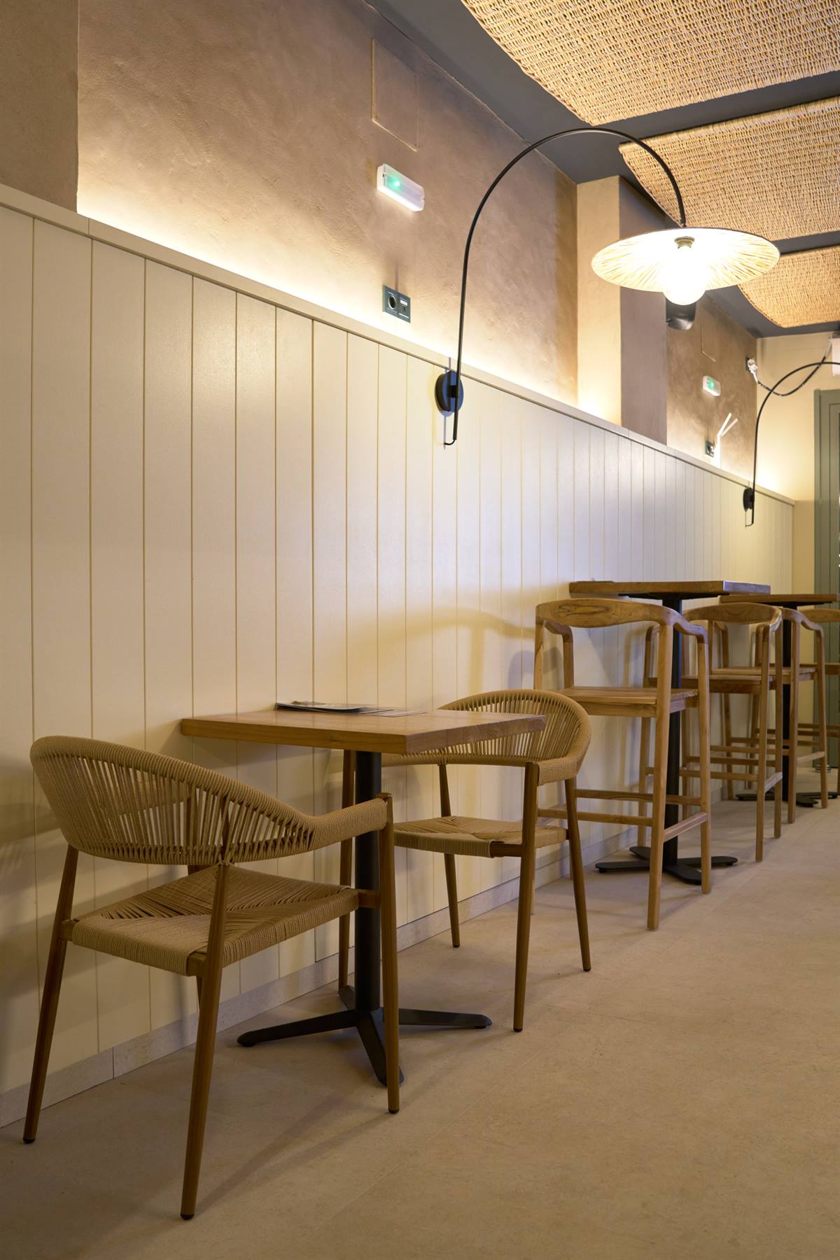L’éclairage joue également un rôle prépondérant dans ce projet, avec une sélection minutieuse de lampes artisanales, accompagnées de meubles en bois et en corde qui renforcent le caractère méditerranéen et naturel de l’espace. Chaque recoin est conçu pour susciter un sentiment de calme, de simplicité et de plaisir.