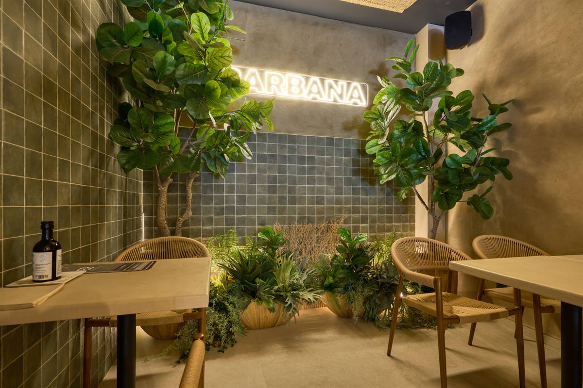 La façade, construite en briques apparentes et à l’esthétique moderne, évoque l’architecture andalouse traditionnelle. En entrant, on retrouve le bar latéral divisé en deux zones fonctionnelles : l’une destinée aux boissons et l’autre au café et aux glaces, ce qui différencie les espaces sans perdre la continuité esthétique.