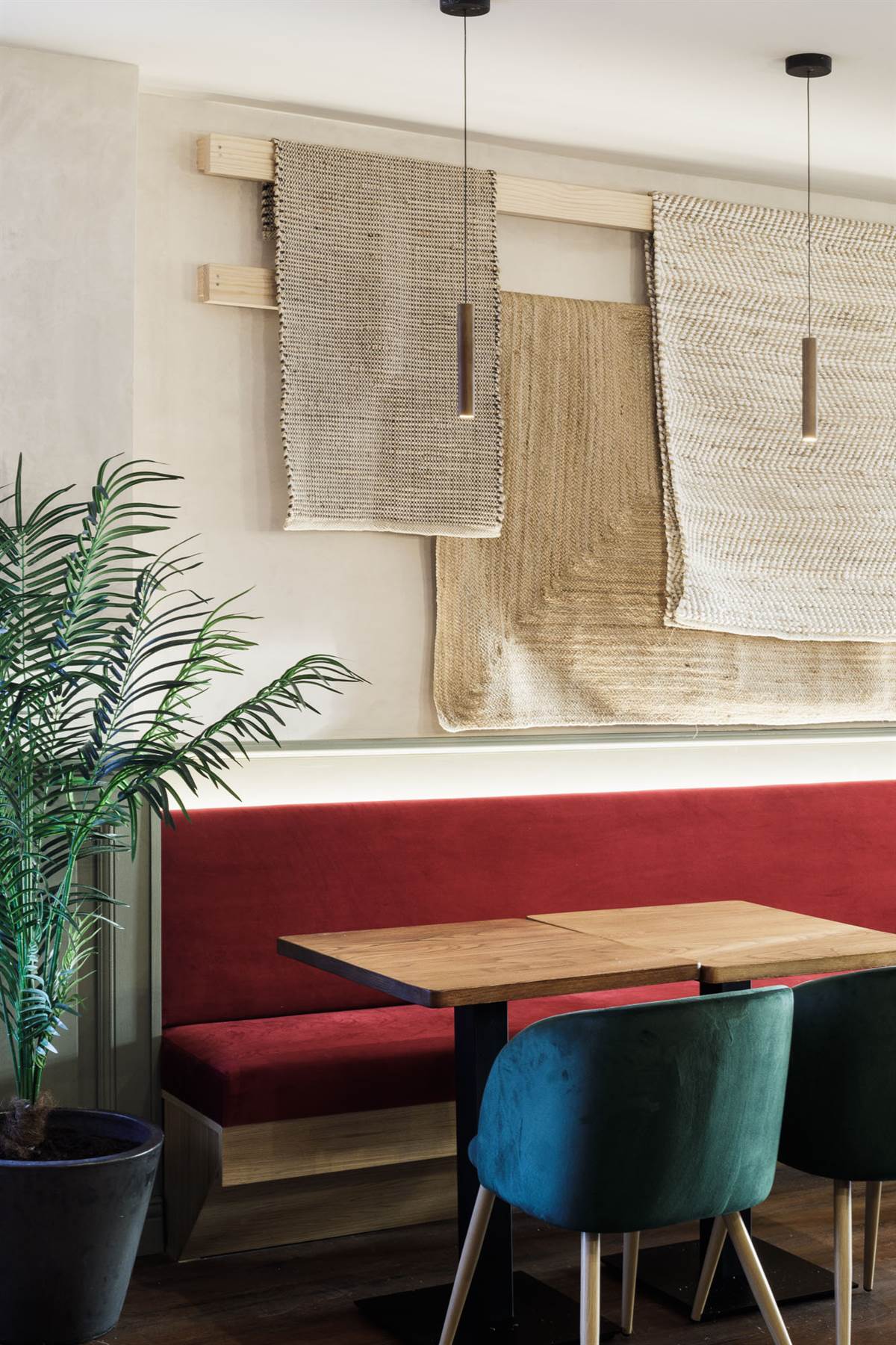 Quant aux chaises, les couleurs de leurs revêtements ont été sélectionnées de façon à ce qu’elles épousent avec harmonie le reste des éléments, comme les briques ou les tapisseries.
