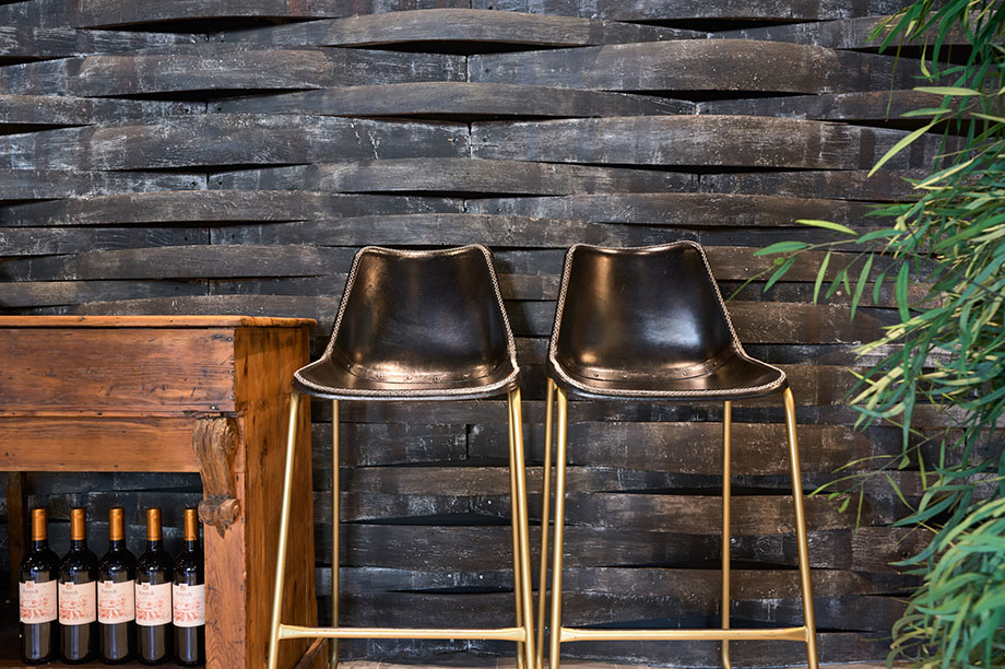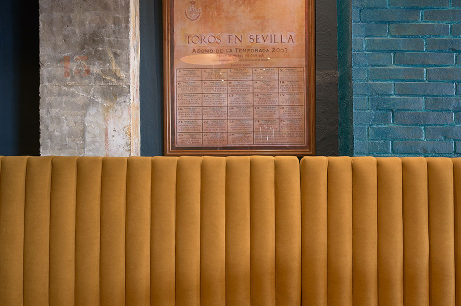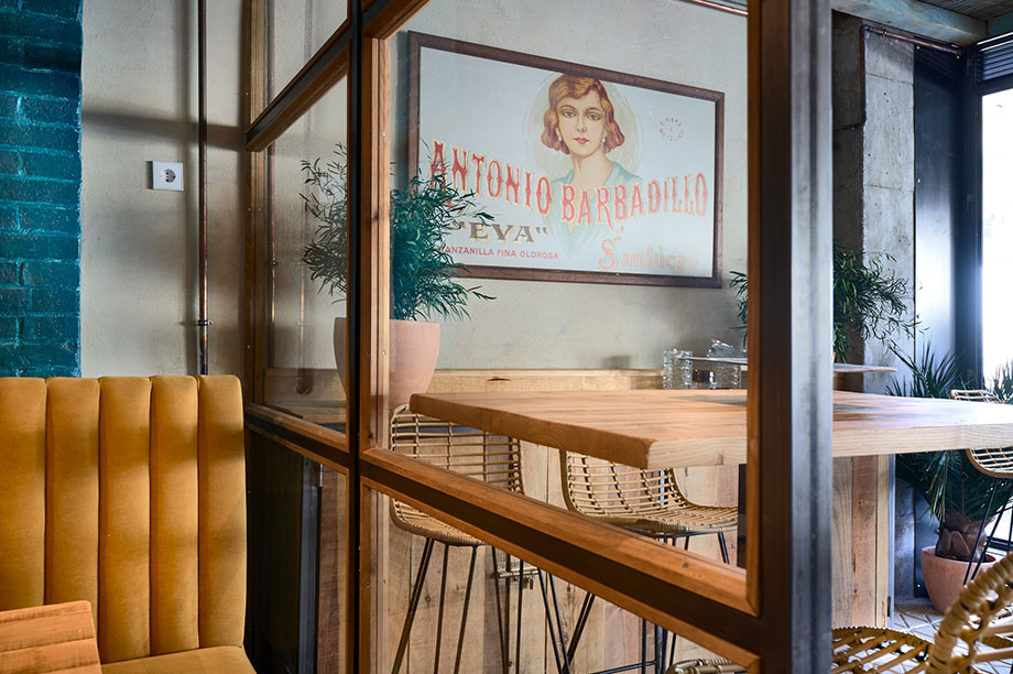 La décoration propose un harmonieux mélange de styles, en passant d’abord par différents types de sols, de la parfaite imitation de l’acier en terrasse, au marbre, en passant par le bois, le tout en jouant avec les murs comme pour différencier les espaces. Une enseigne lumineuse vintage « Cruz Campo » célèbre bière locale apporte une touche rétro. Le bar en verre laisse apparaître les nombreux fûts de la bière andalouse.
