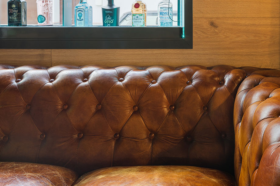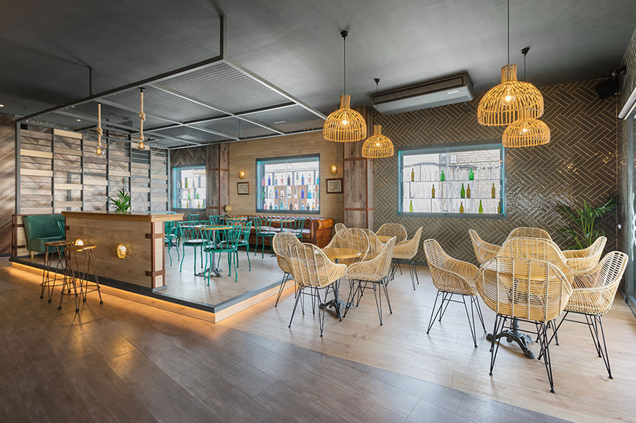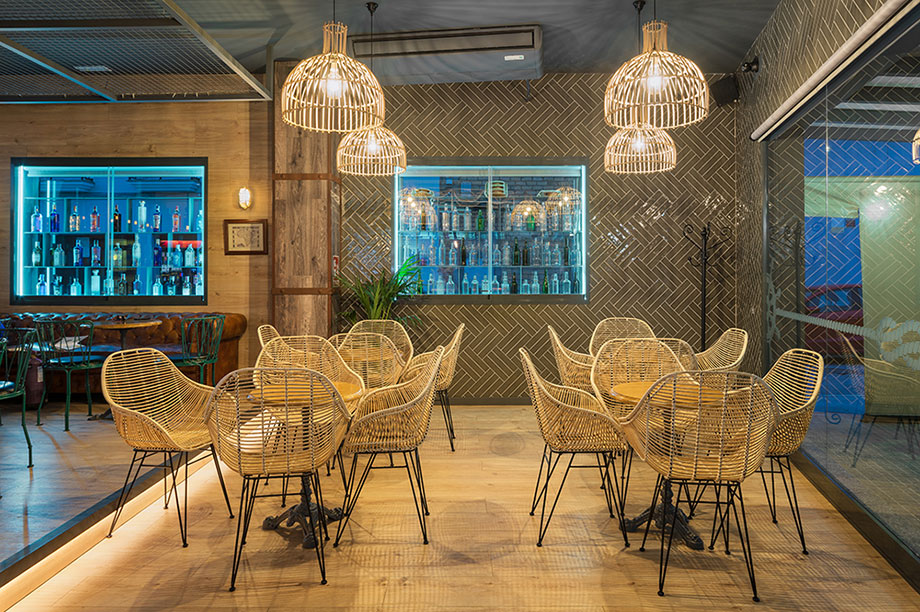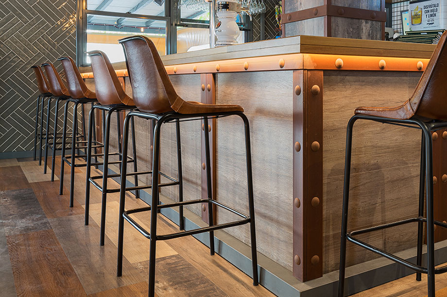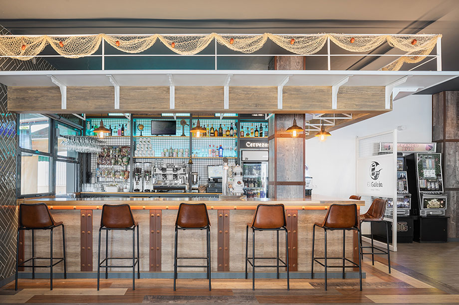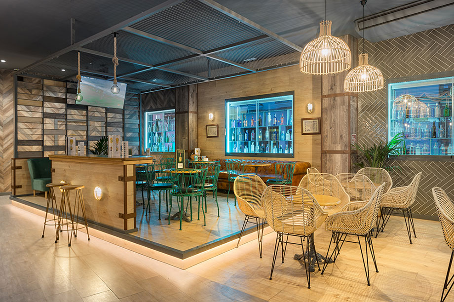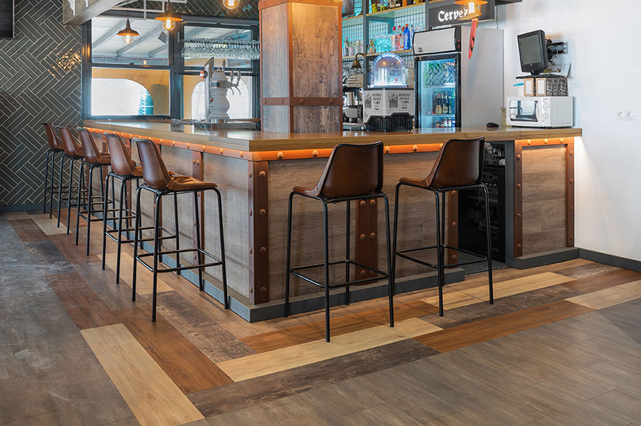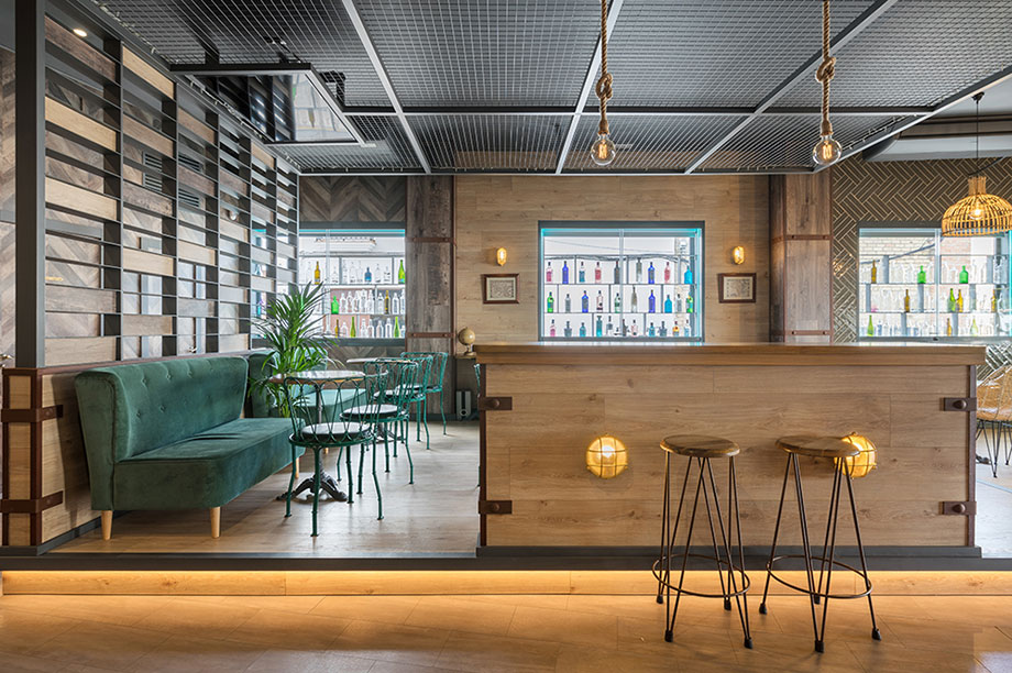 Le choix des matières a été essentiel pour déterminer l’identité propre de cet établissement, différentes finitions de bois nous donnent la sensation d’un navire en train de couler. L’application de revêtement avec reflets et un jeu de textures et de lumières nous plongent tout droit au fond de l’océan.