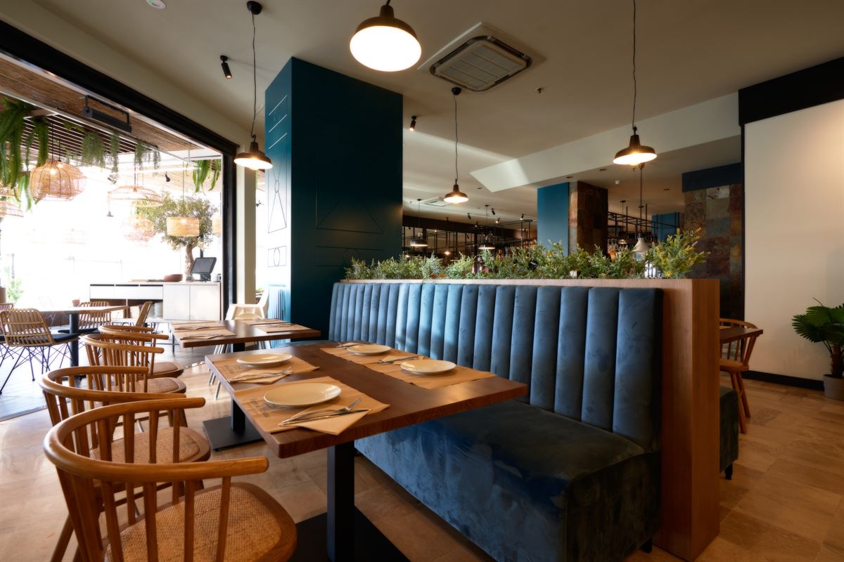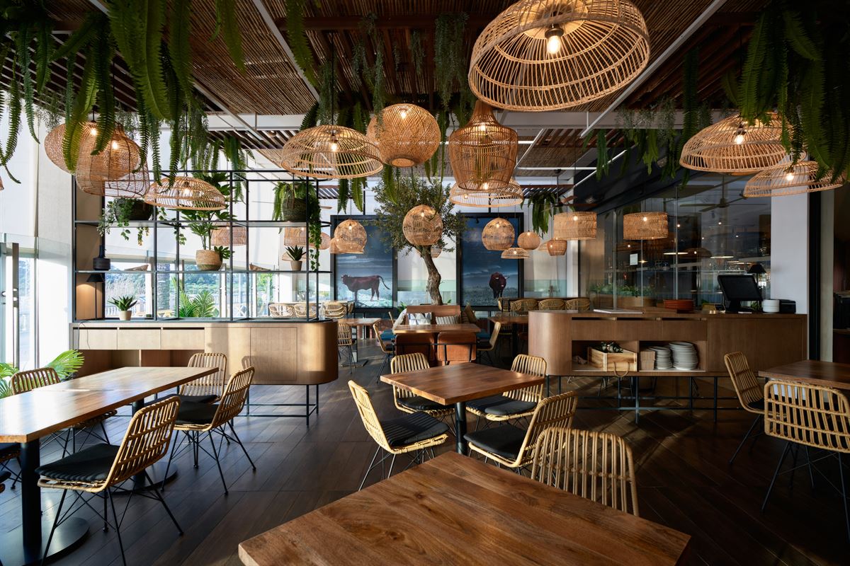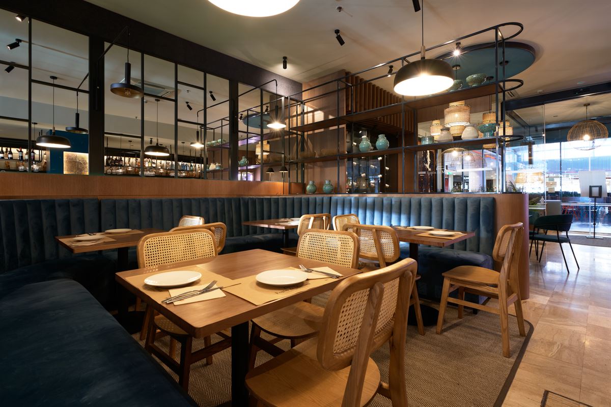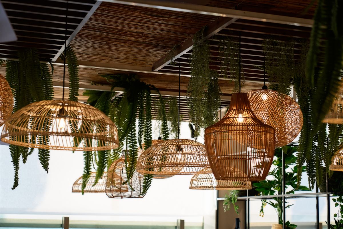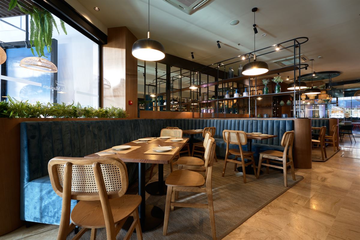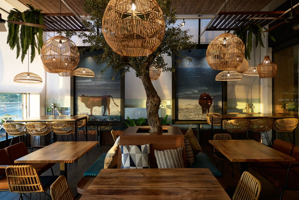 Avec une prédominance des couleurs marine, marron et terre dans les chaises et les tables ; des matériaux naturels comme le bois, le rotin ou la corde pour les chaises et les paravents ; et la fraîcheur des métaux noirs dans les luminaires et les étagères, ou le verre dans certaines de ses lampes. Le tout nous enveloppe dans un espace plein de détails et très chaleureux, pour y déguster de mets savoureux entouré d’une décoration soignée.