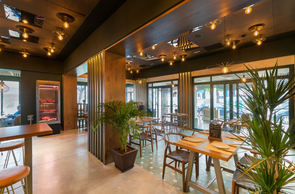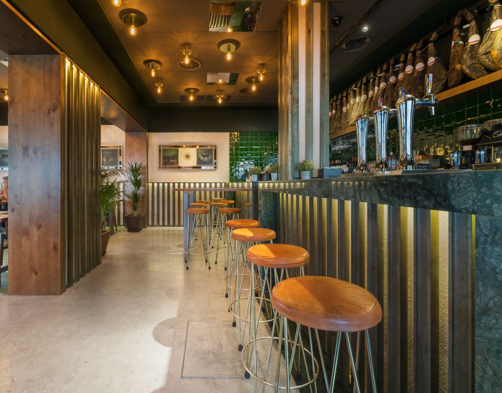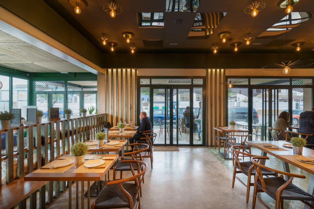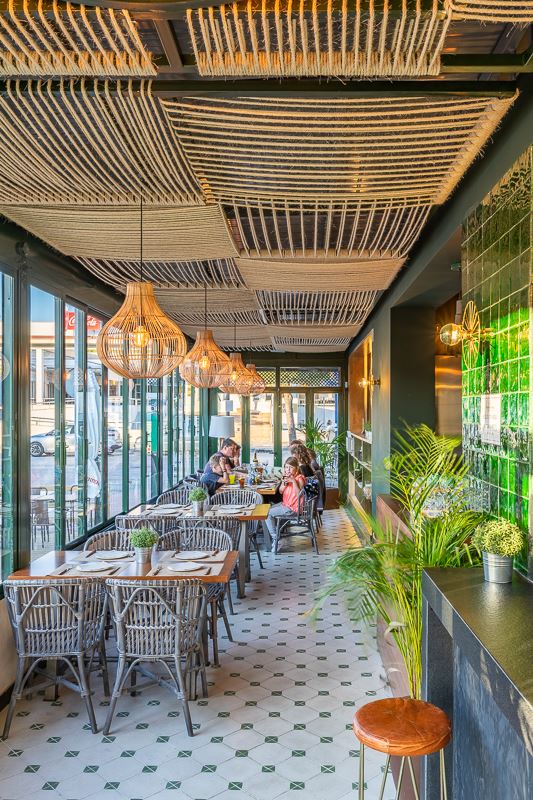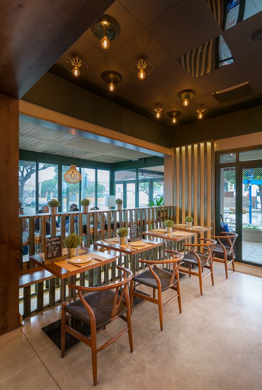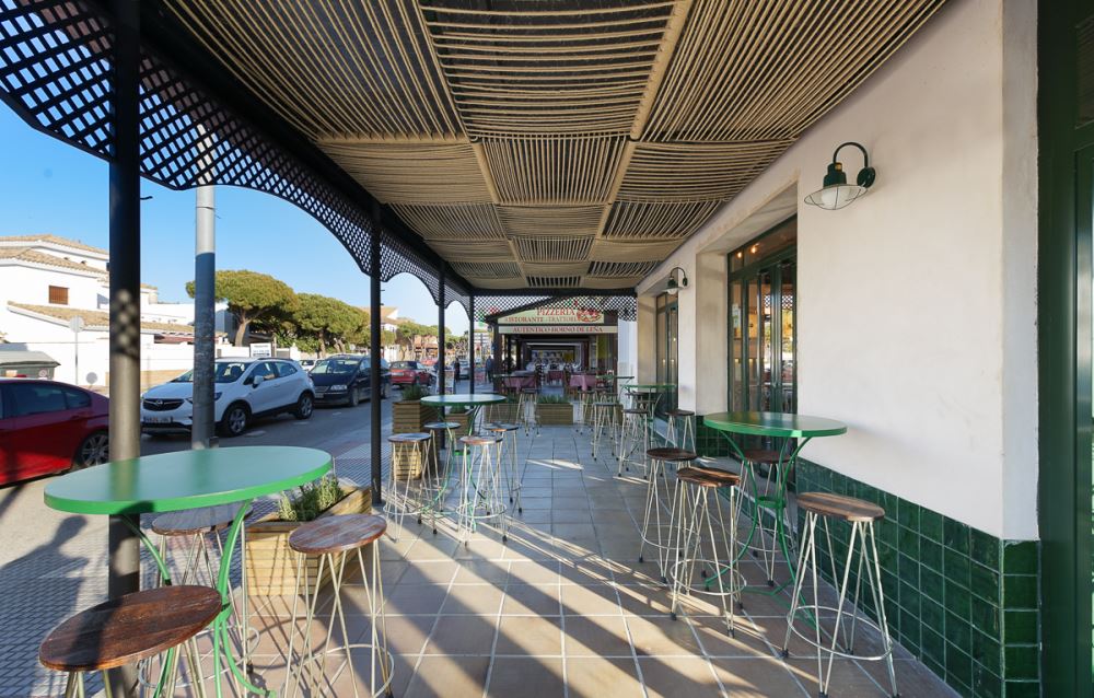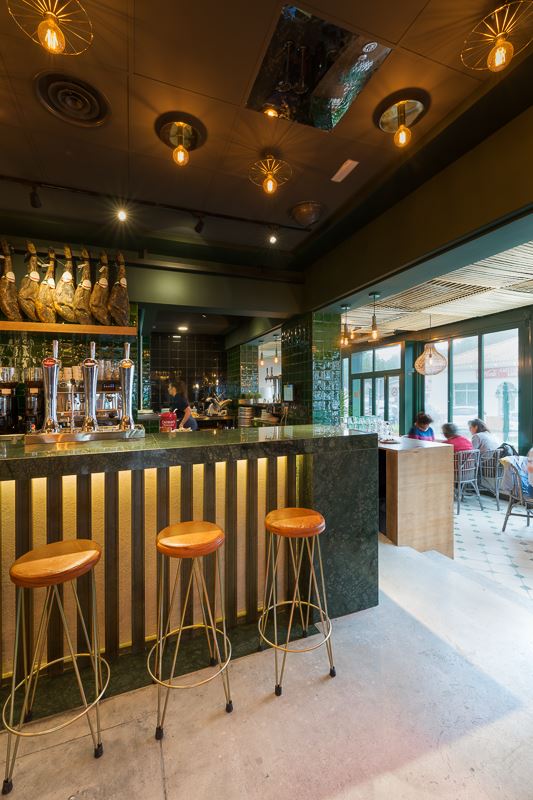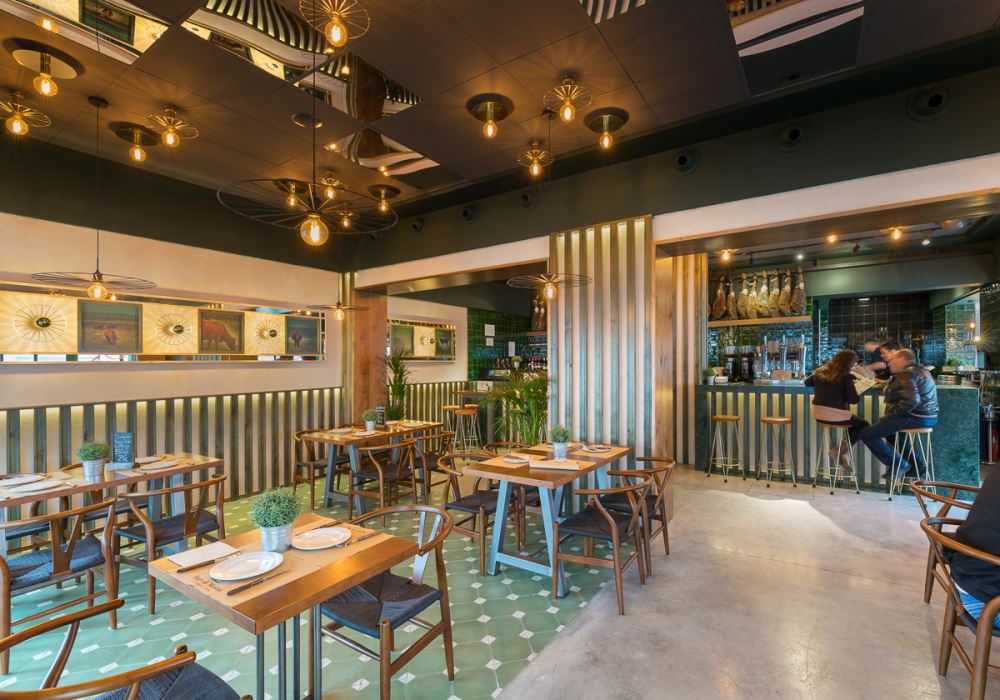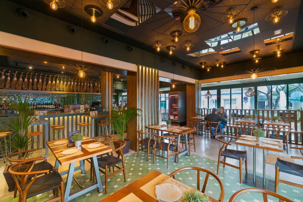L’endroit se compose de plusieurs espaces, d’abord l’entrée, avec quelques tables et le bar au fond, au second plan. Autour du bar on retrouve les éléments caractéristiques des lieux: la céramique verte, le bois, et les jambons suspendus qui nous rappellent bien que l’on se trouve en terre andalouse. La salle de restaurant est bien délimitée avec son plancher en lattes de bois peintes en vert qui donne du relief au revêtement initial du sol, et facilite la séparation entre les différents espaces. L’autre côté de la pièce donne sur une terrasse semi-ouverte, reliée à l’entrée principale et à l’extérieur. Pour le plafond, ils ont opté pour de la corde de sisal.