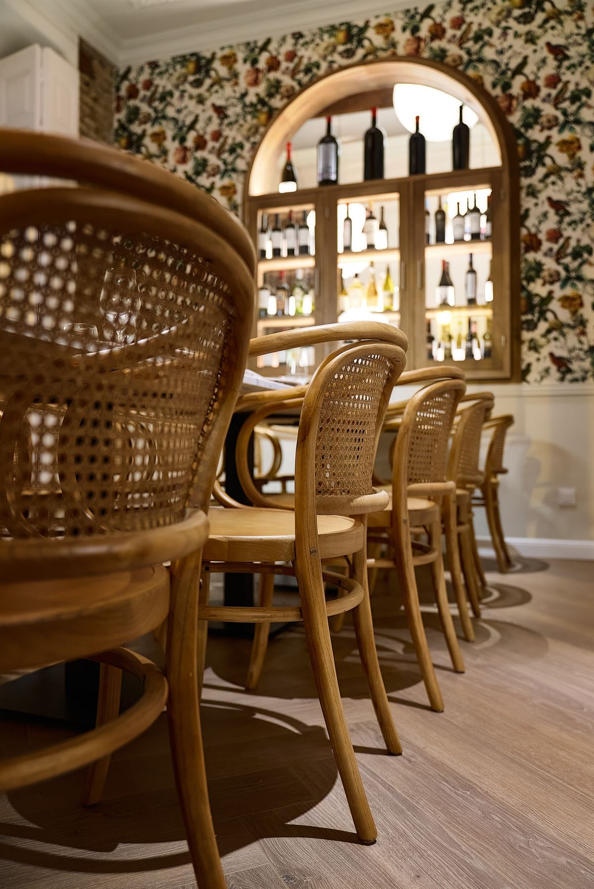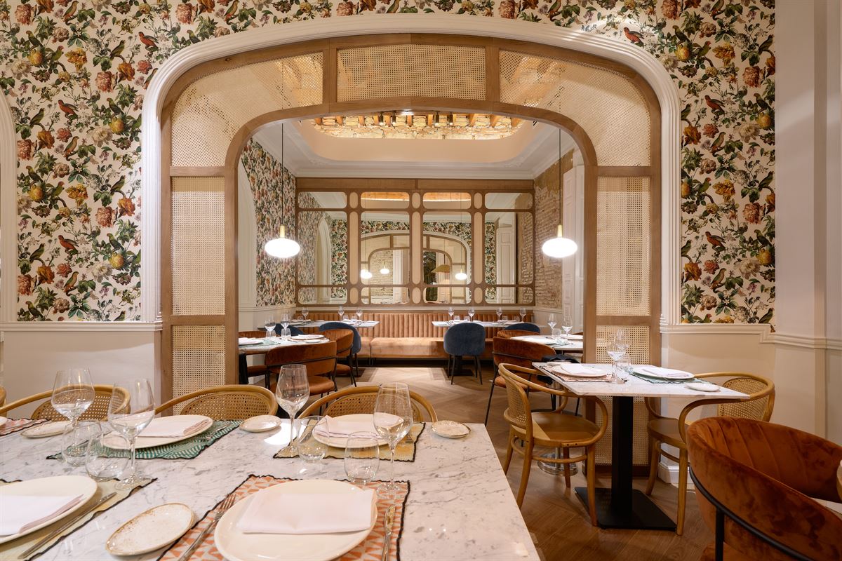 La conception de ce projet décoratif, qui comme nous l’avons dit est rempli de détails extraordinaires, a été réalisée par l’équipe de design d’intérieur MisterWils, qui a su créer une atmosphère théâtrale avec une grande originalité, avec des meubles principalement en bois et en tissu, créant des espaces très accueillants et lumineux. Les murs ne peuvent passer inaperçus, et encore moins le miroir qui est le protagoniste principal de toute la scène. Diviser l’espace en petites pièces et décorer le passage de l’une à l’autre de treillis de bois et de cannage crée une esthétique admirable. Les vitrines où se trouvent les vins ne passent pas inaperçues non plus, certaines servent de séparation et d’autres sont des décorations parfaites pour ce projet si particulier.