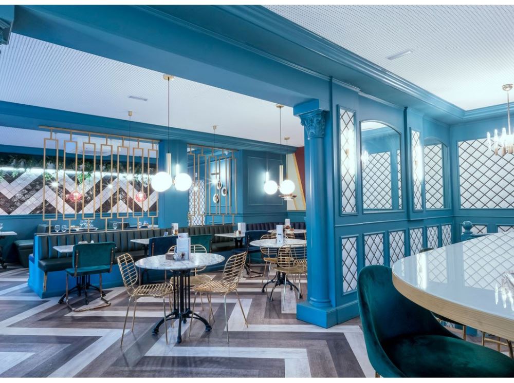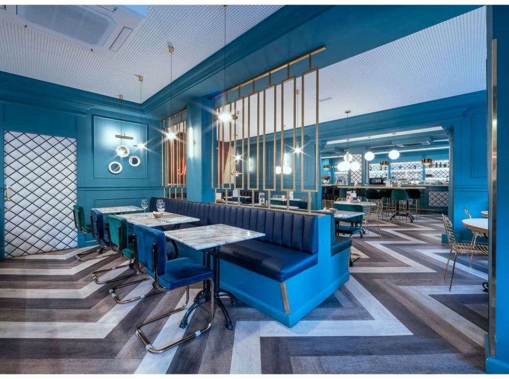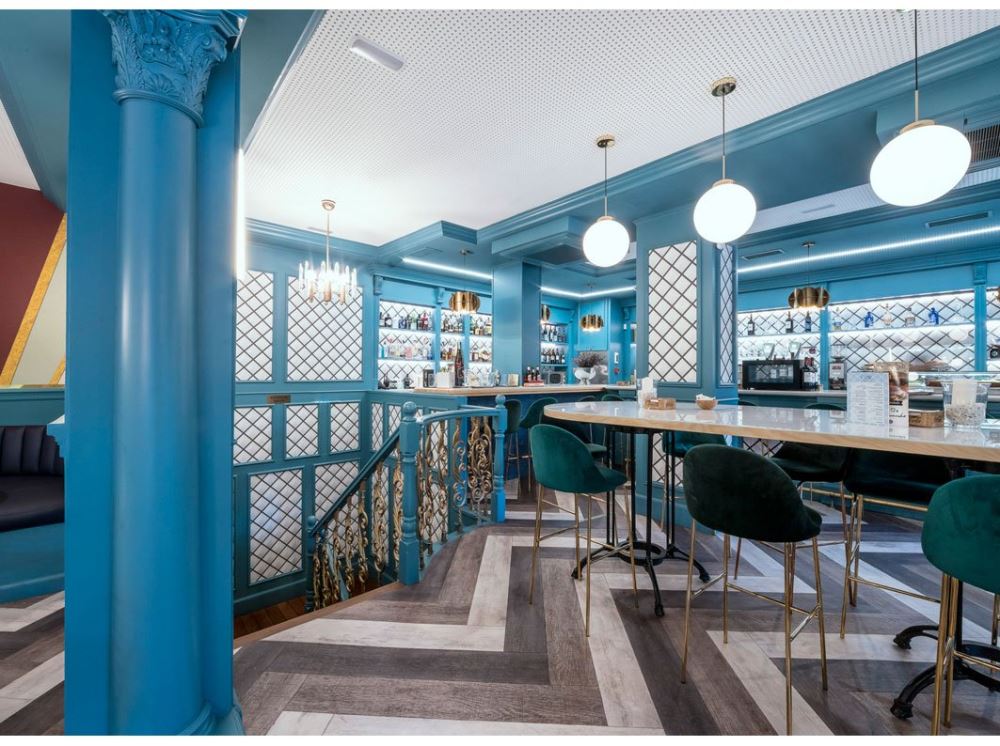 Une ancienne confiserie spécialisée dans les churros constitués de deux locaux mitoyens laisse place à un nouveau restaurant en plein coeur de Madrid décoré dans un style rétro avant-gardiste. En plus des confiseries, ce nouvel espace propose désormais déjeuners et dîners, dans une ambiance aux tons bleu ciel rafraîchissants, éclairée par une lumière chaleureuse qui se reflète sur le sol en vinyle imitation bois. Dans un décor rappelant les années 70, les canapés en cuir se mêlent aux chaises en velours au milieux de structures en bois peint.