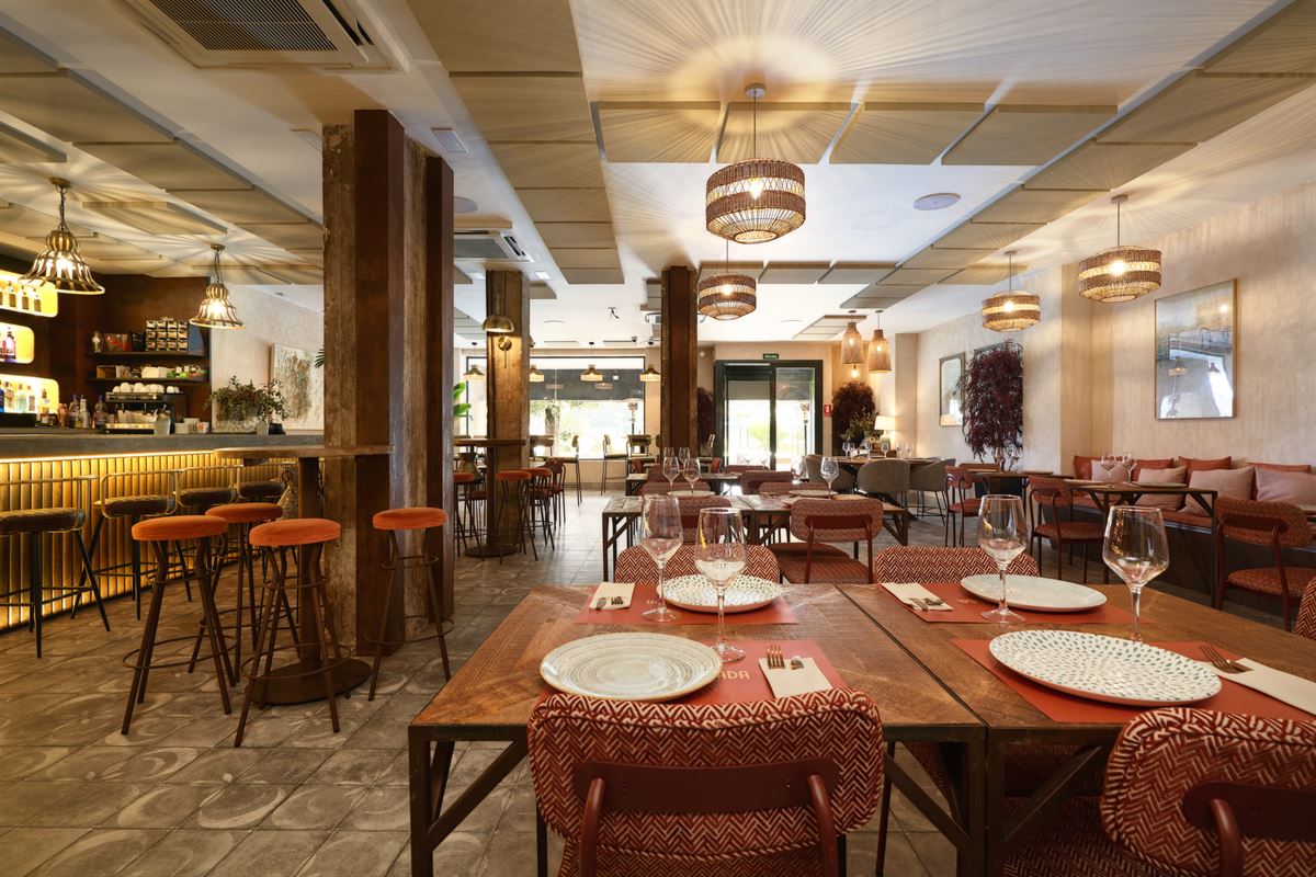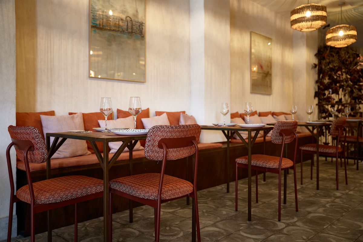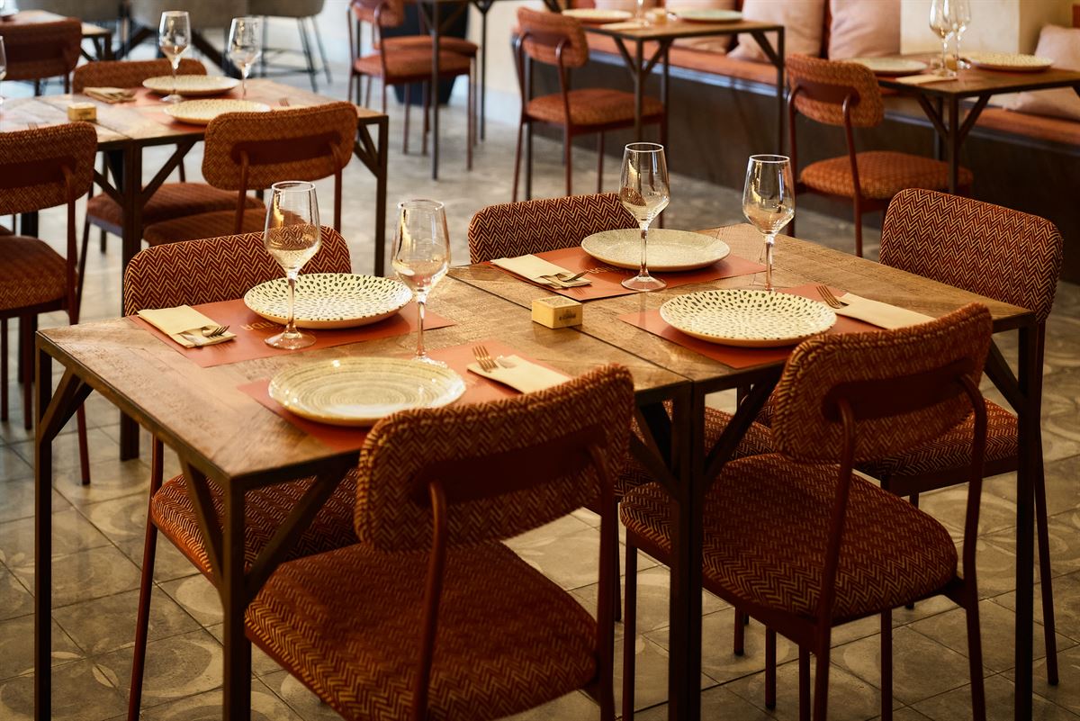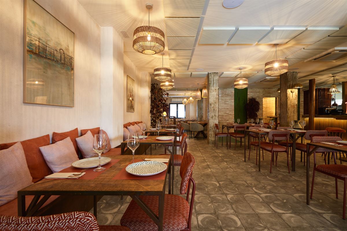 Le restaurant dispose d’un vaste étage principal, où le protagonisme repose sur le salon ouvert où les tables basses sont accompagnées de chaises tapissées aux motifs géométriques. Les colonnes et le sol prennent une grande importance, créant une atmosphère aux touches industrielles où la décoration colorée et les matériaux naturels, comme le bois ou le rotin, rompent avec elle et créent une chaleur qui invite les clients à passer une soirée détendue et accueillante.