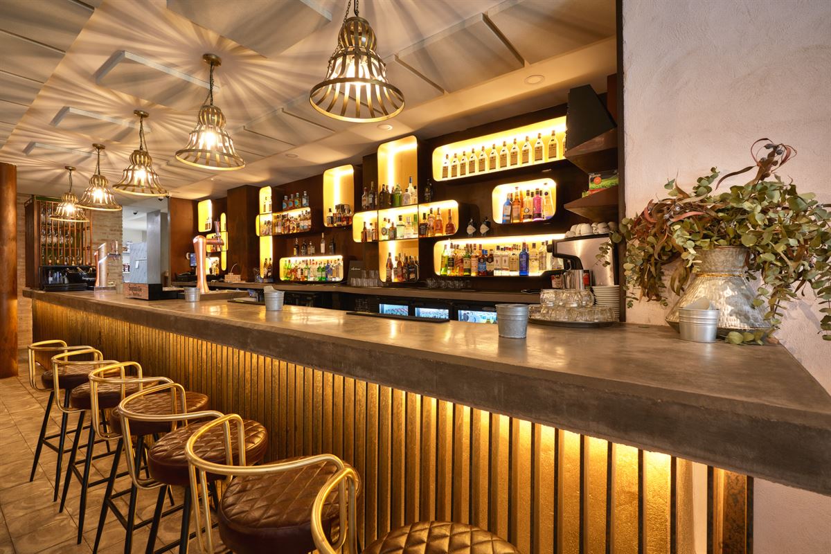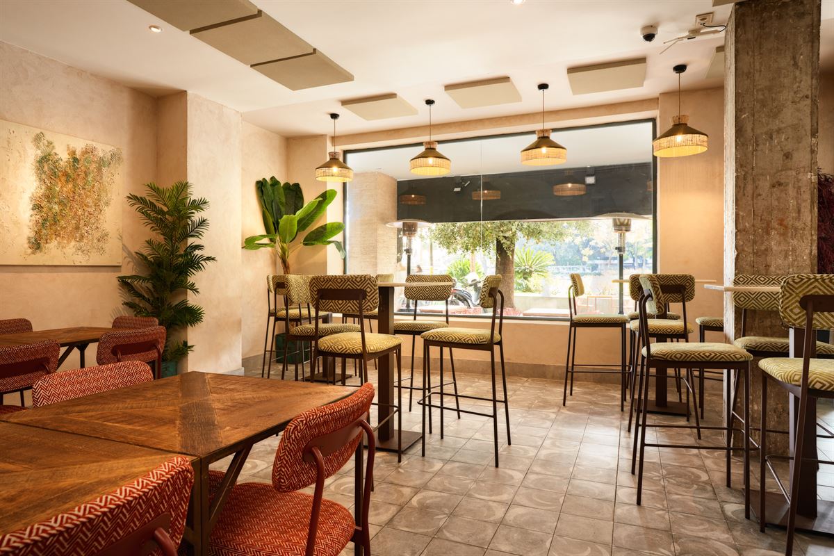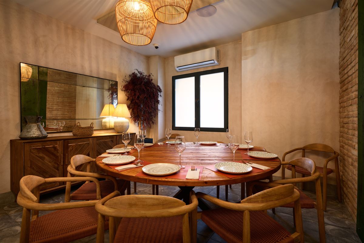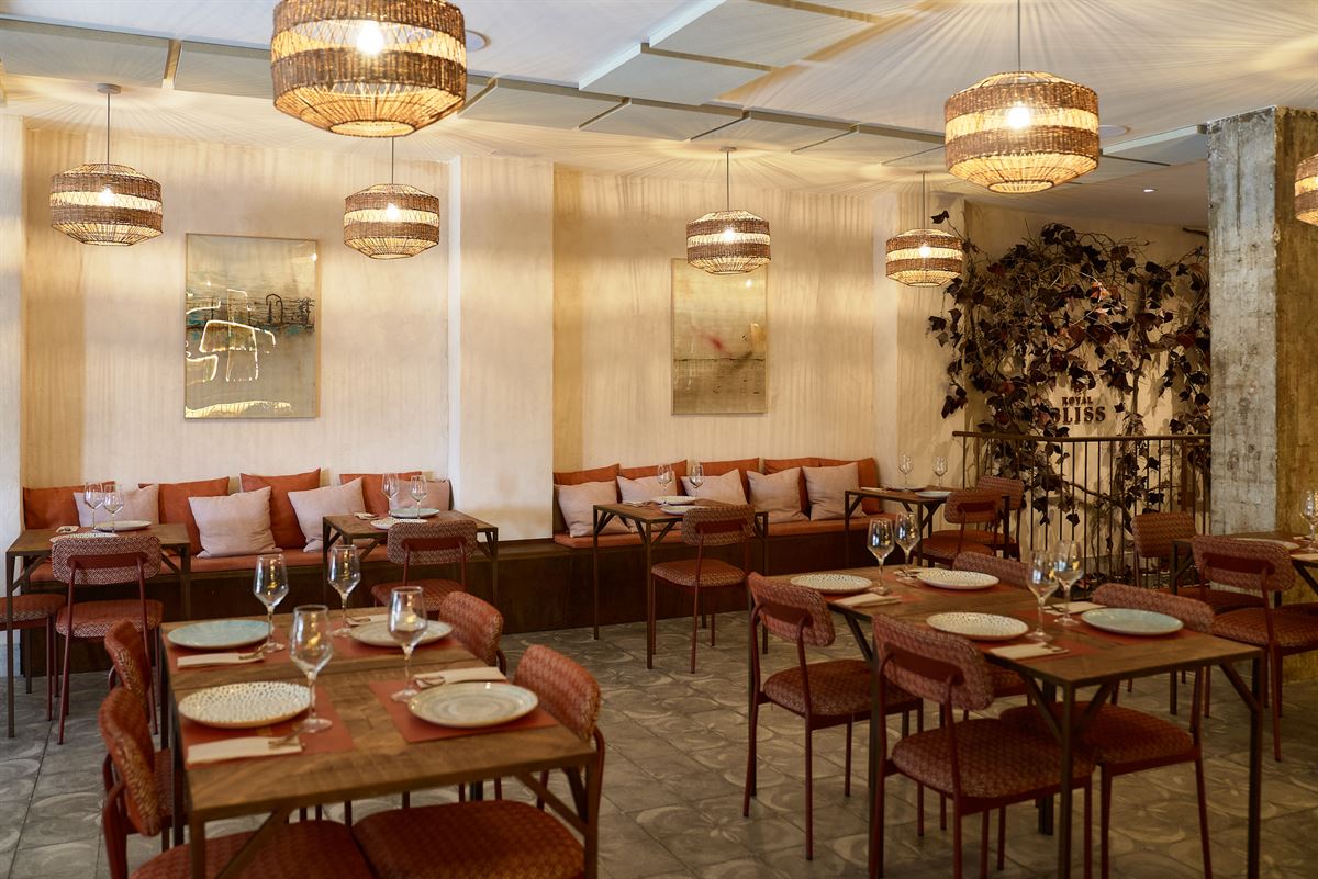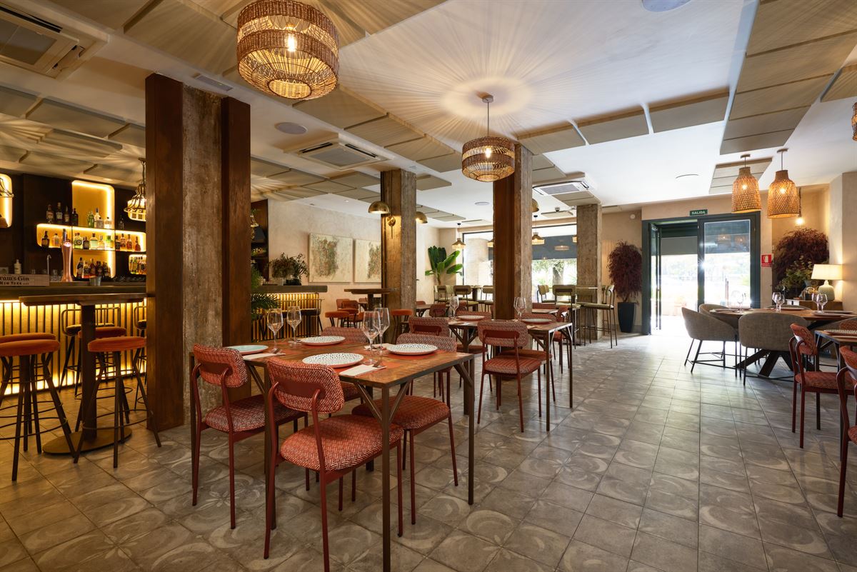 Le restaurant dispose d’un vaste étage principal, où le protagonisme repose sur le salon ouvert où les tables basses sont accompagnées de chaises tapissées aux motifs géométriques. Les colonnes et le sol prennent une grande importance, créant une atmosphère aux touches industrielles où la décoration colorée et les matériaux naturels, comme le bois ou le rotin, rompent avec elle et créent une chaleur qui invite les clients à passer une soirée détendue et accueillante.