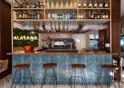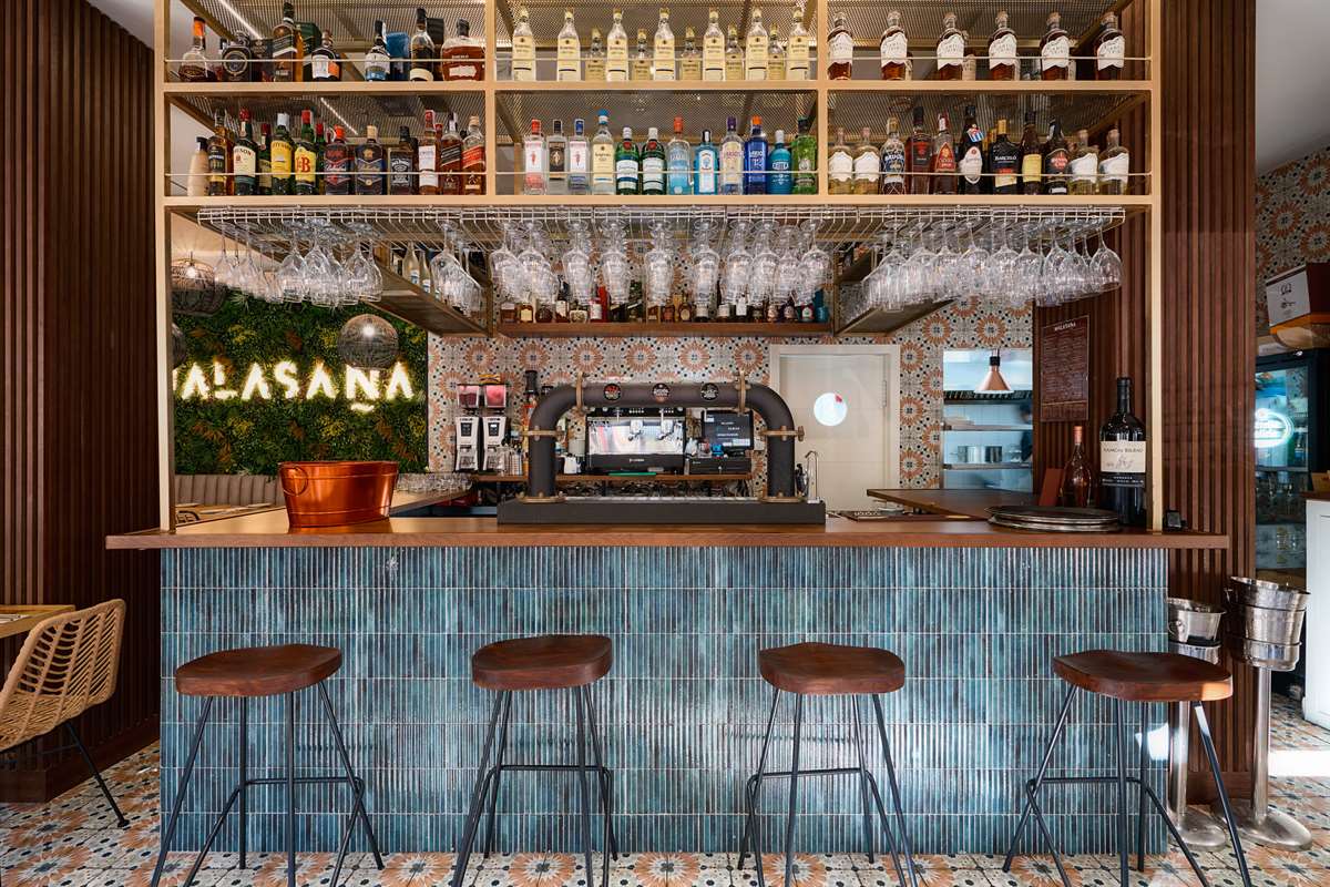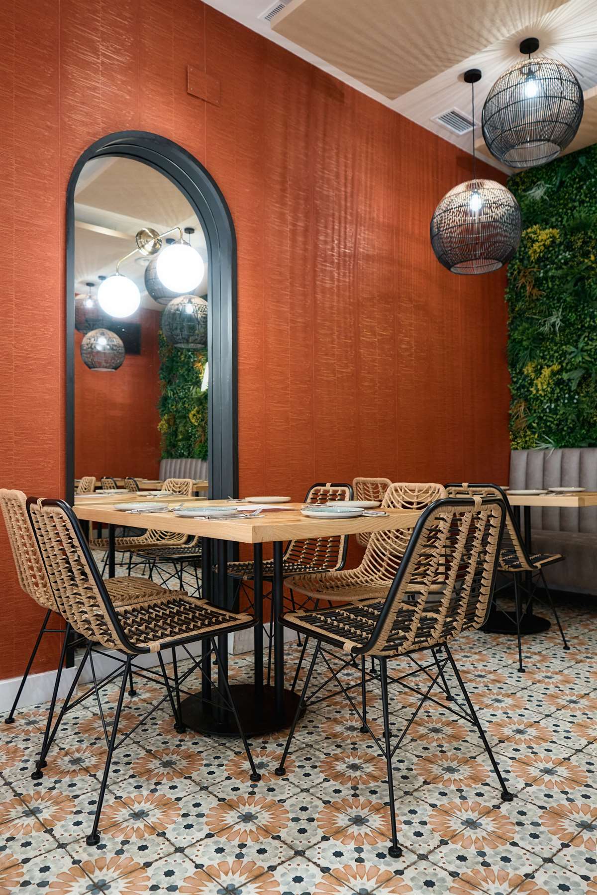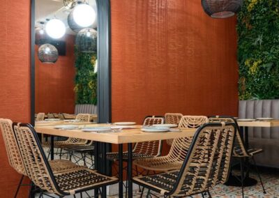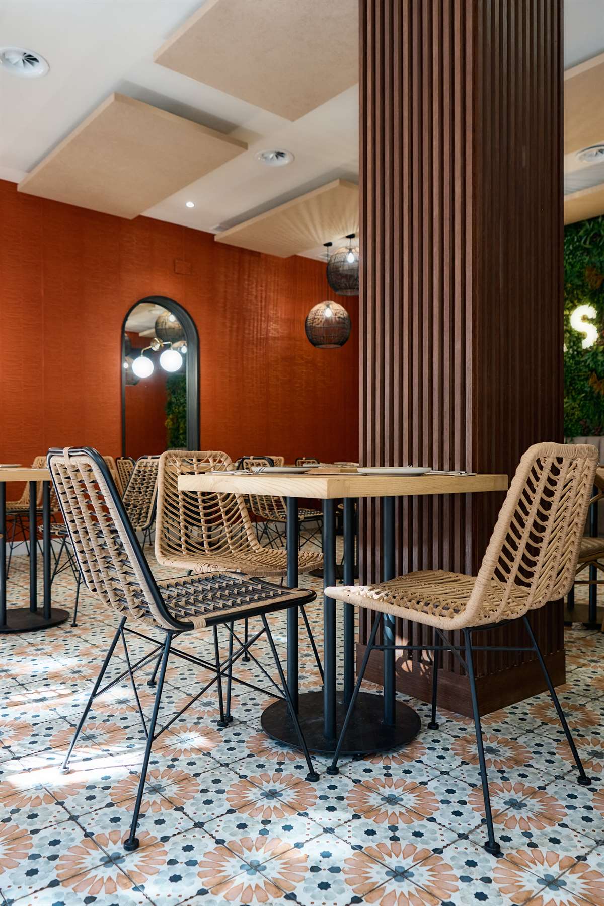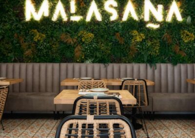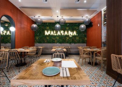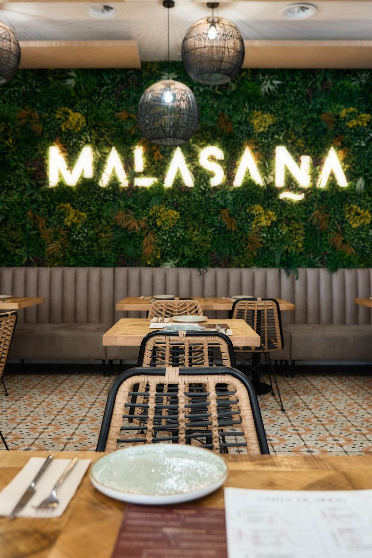 Après une rénovation exhaustive, Malasaña s’est transformé en un environnement accueillant et parfaitement intégré au quartier grâce à de grandes baies vitrées qui relient la terrasse à l’intérieur. Les murs aux tons terracota sont ornés de grands miroirs, tandis que les colonnes sont recouvertes d’un revêtement en lattes de bois et les sols sont en tuiles hydrauliques. En arrière-plan, sur un espace de banquettes tapissées, se déploie un jardin vertical qui encadre un panneau lumineux au nom de l’établissement.