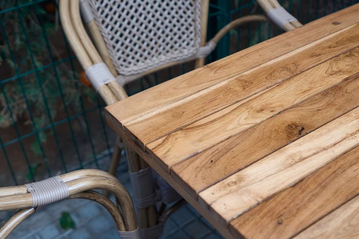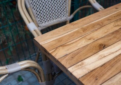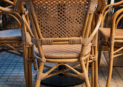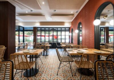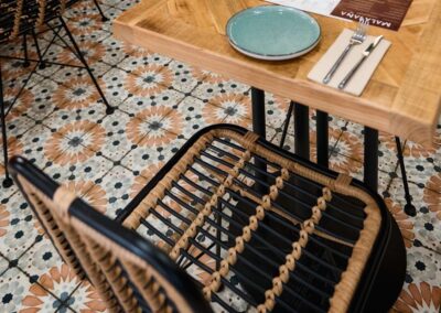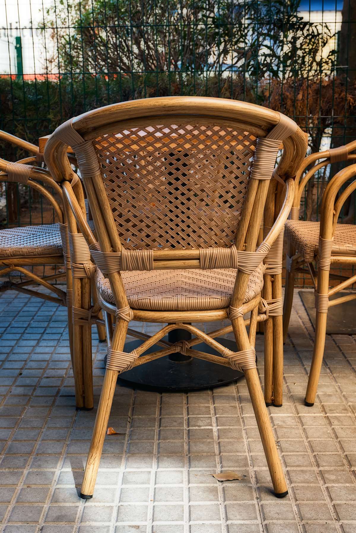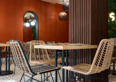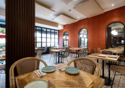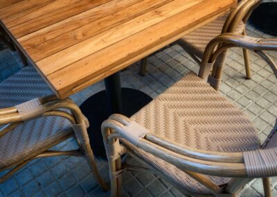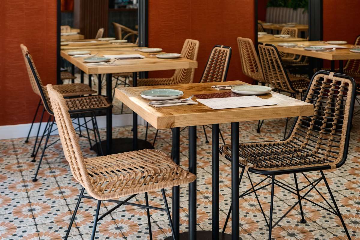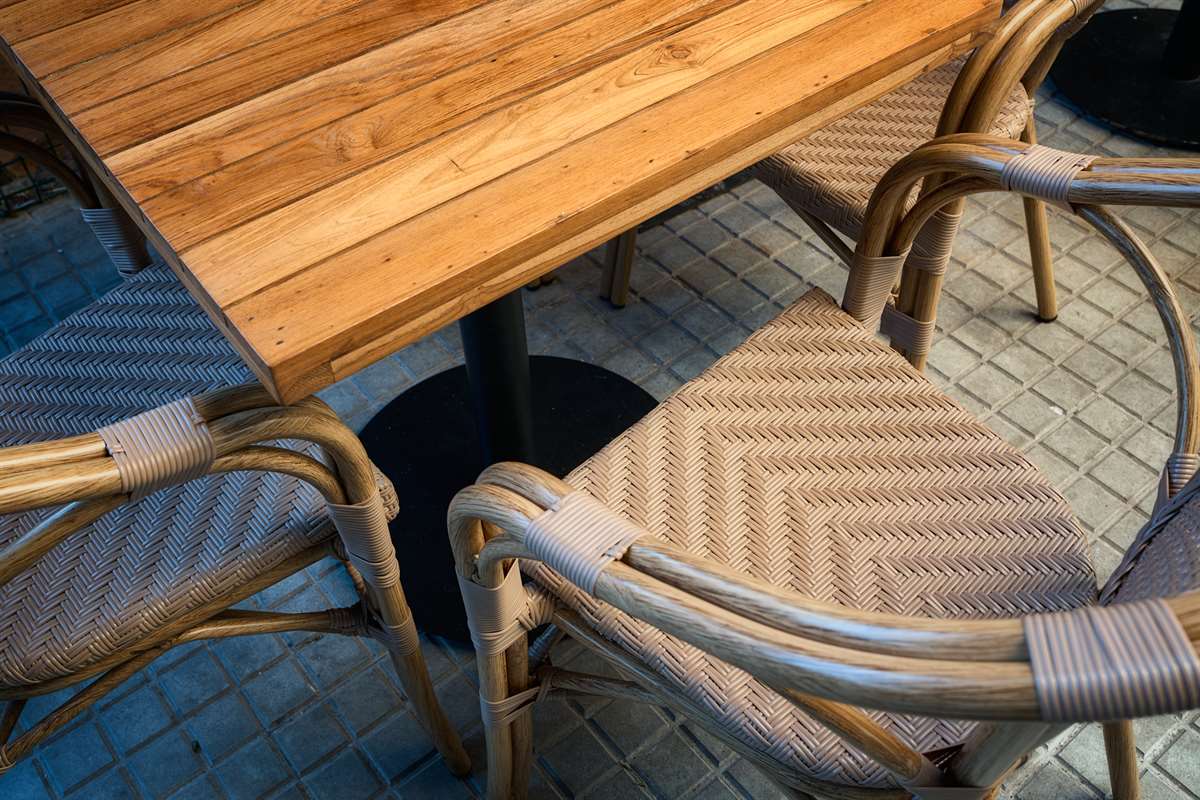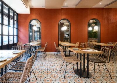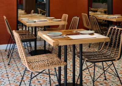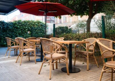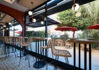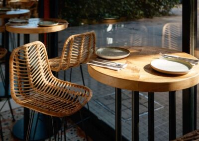 Les chaises en rotin et les tables en bois sont placées sur une agréable terrasse à côté d’un petit jardin, offrant un espace de répit loin de l’agitation de la circulation. Les tables hautes sont situées à côté des grandes fenêtres et devant le bar, où l’on retrouve également des tabourets hauts. Dans la pièce intérieure, nous retrouvons l’ensemble formé de chaises en rotin et de tables en bois avec structure en métal qui, avec la décoration, apportent ce cachet si caractéristique d’un bistro moderne.