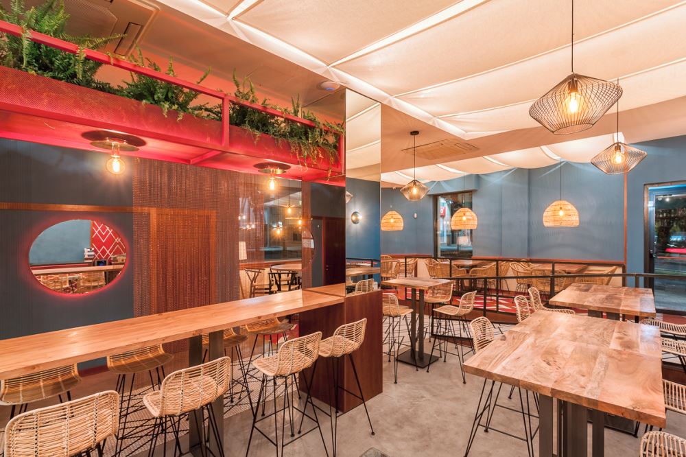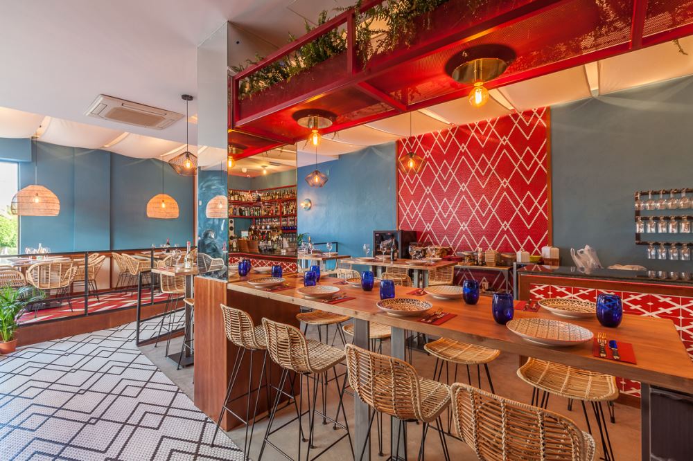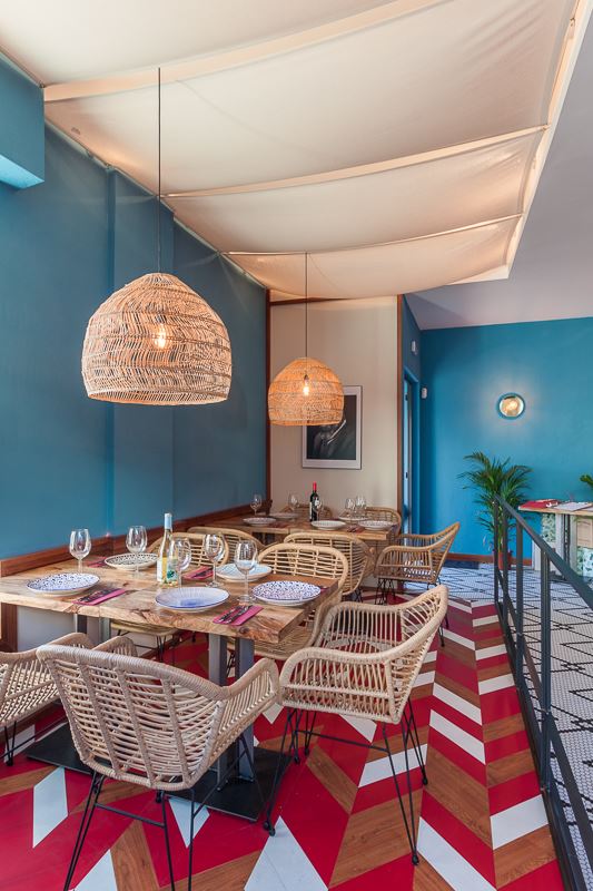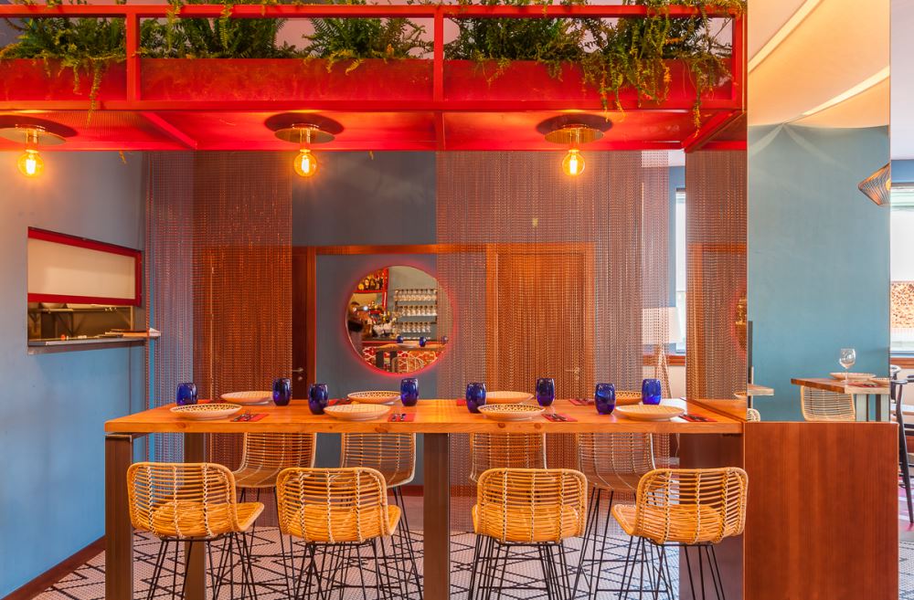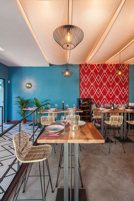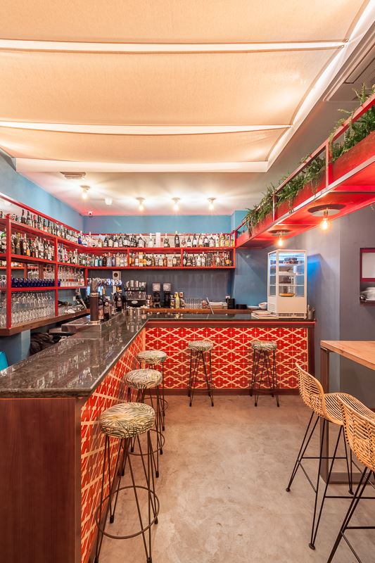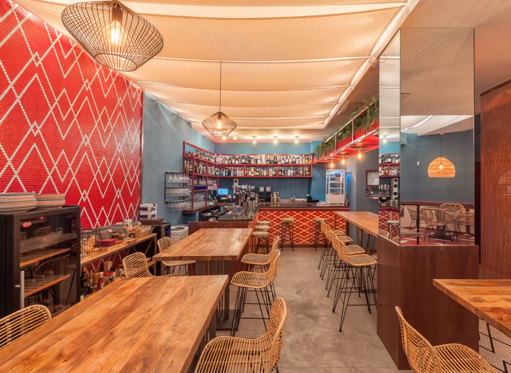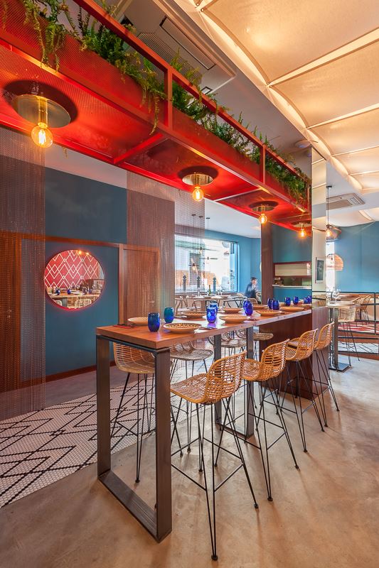 Dans l’espace bar, le rouge est prédominant, et se mêle élégamment au milieu des verres suspendus et des plantes décoratives. Enfin, quelques détails personnels tels que des chaînes en cuivre et un miroir circulaire pour séparer le hall des sanitaires, viennent donner au Mariola une ambiance unique.