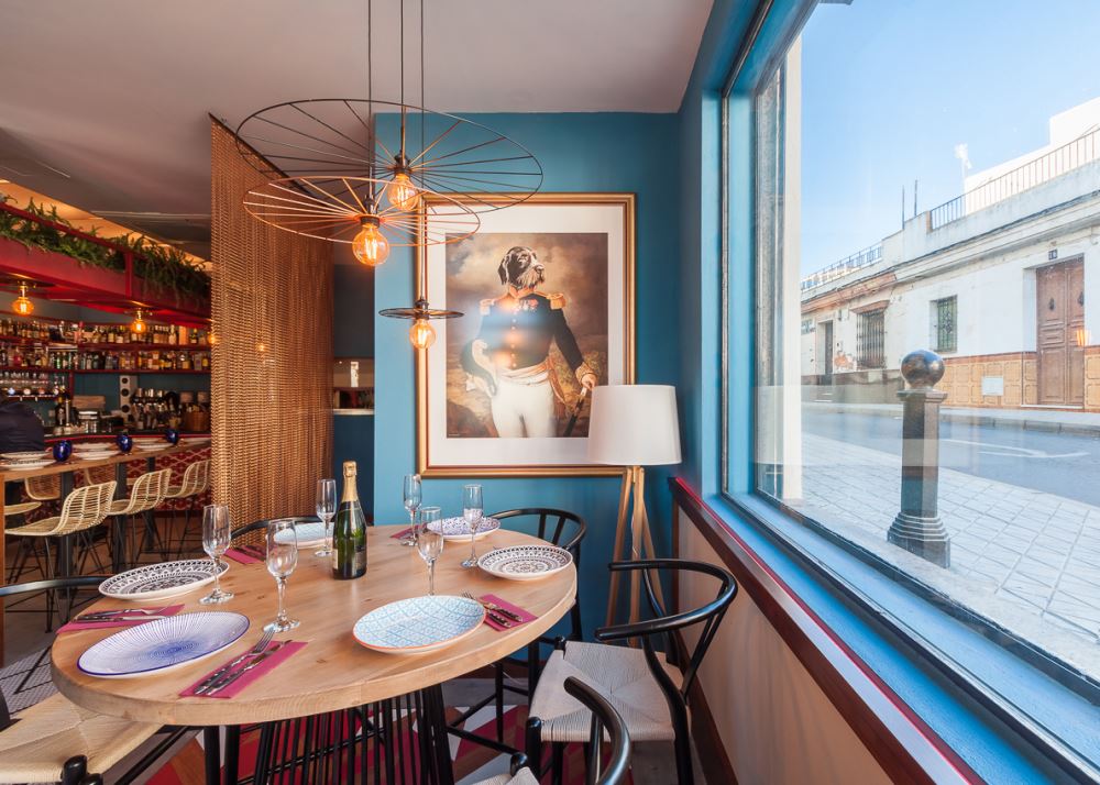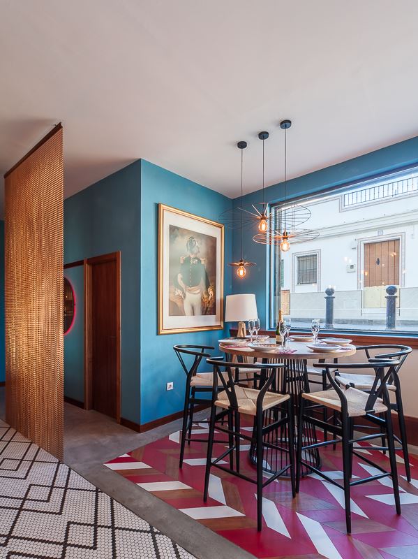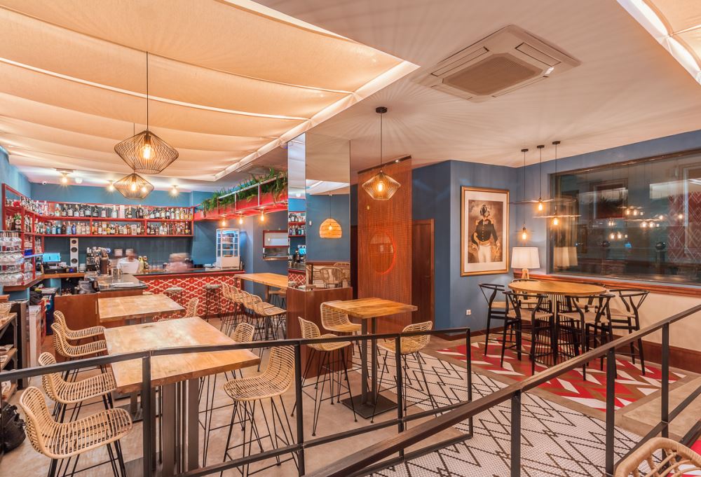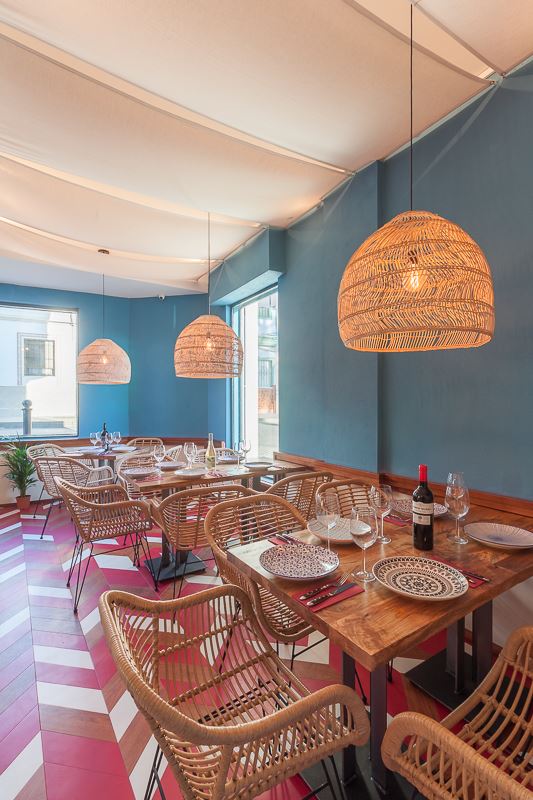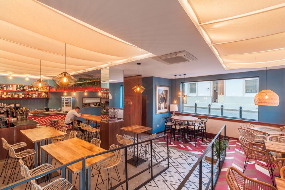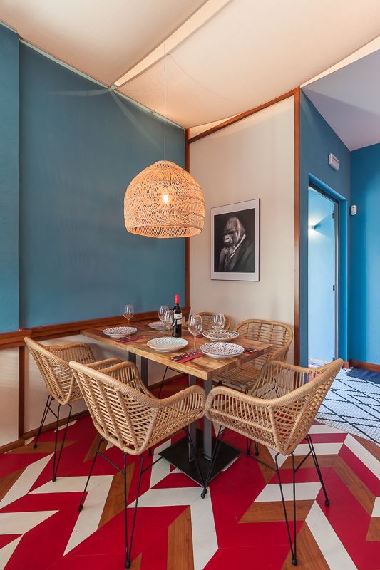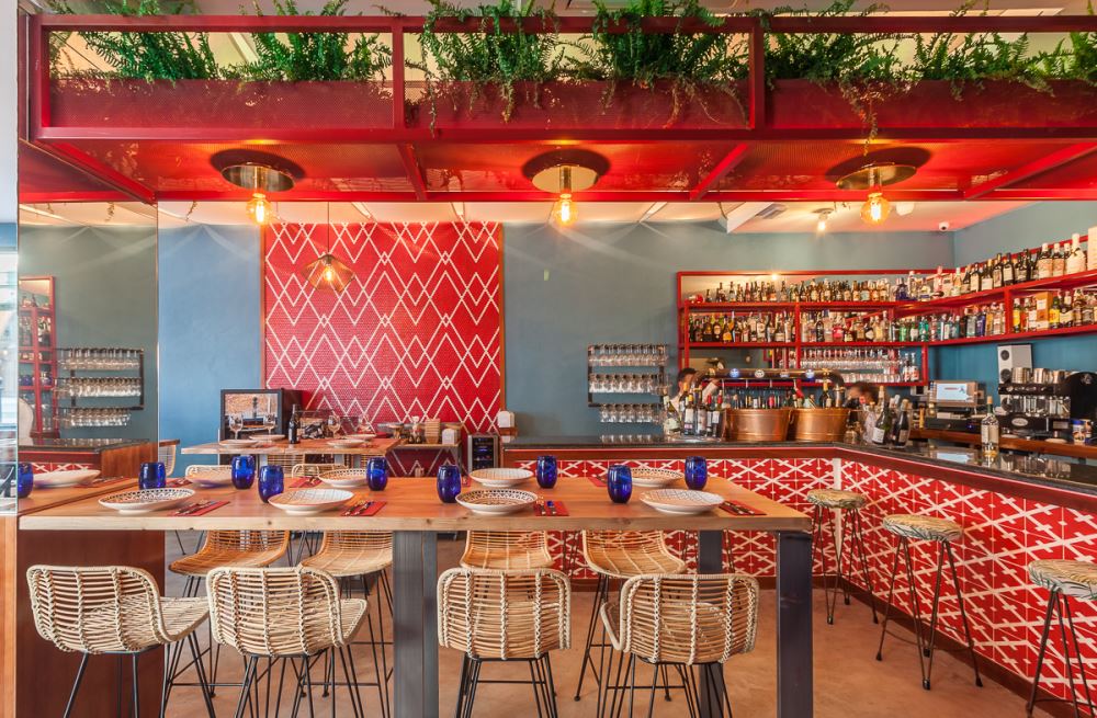 Dans l’espace bar, le rouge est prédominant, et se mêle élégamment au milieu des verres suspendus et des plantes décoratives. Enfin, quelques détails personnels tels que des chaînes en cuivre et un miroir circulaire pour séparer le hall des sanitaires, viennent donner au Mariola une ambiance unique.