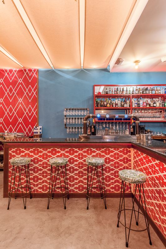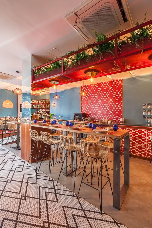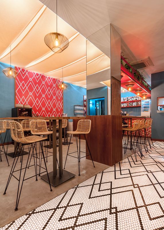 Une fois à l’intérieur, trois possibilités: se diriger vers la zone inférieure, la principale ou bien aller vers la droite, où des tables basses vous accueillent sur un sol en vinyle rouge et blanc, donnant un aperçu de la gamme chromatique que vous retrouverez tout au long de votre visite. Dans la zone inférieure, des tables hautes où les différents espaces sont différenciés par des carreaux de grésite , formant des formes géométriques au sol, le reste étant laissé en béton poli. Les carreaux de grésite se retrouvent aussi sur les murs, et sont ainsi l’un des éléments centraux du projet, formant désormais partie de l’image de marque du restaurant.