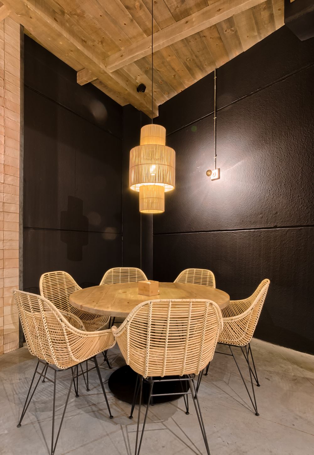 Pour cette réalisation, Bruno et Adrian on choisi dans le catalogue MisterWils les produits suivants : chaises Bucket Natural et Alaska. tabourets Maiden, lampes Newtown Black, Porto, Bennet et Pirata oxido, tables Rural Blue Brown, Breuer et Ferro Black, et des panneaux muraux faits sur mesure, tapissés en imitation peau.
