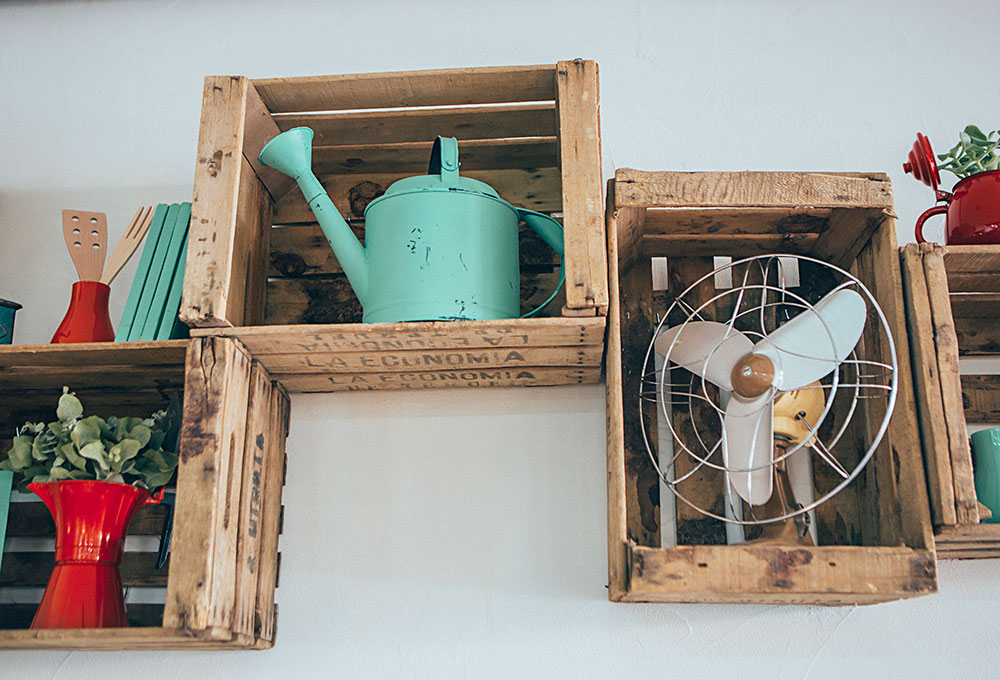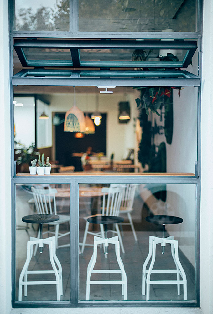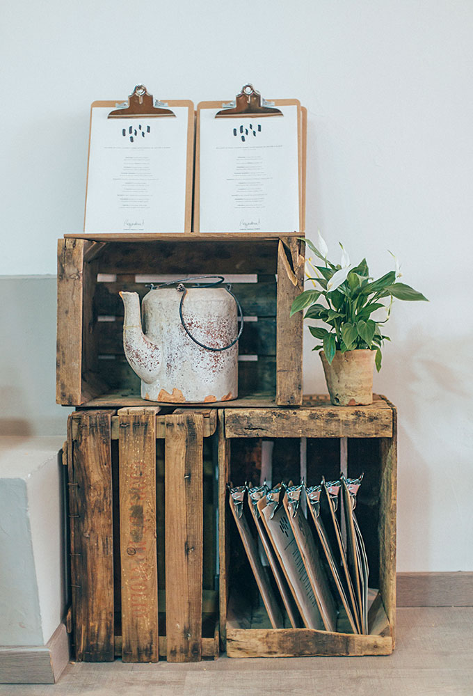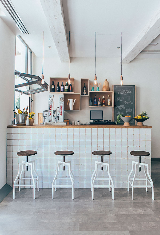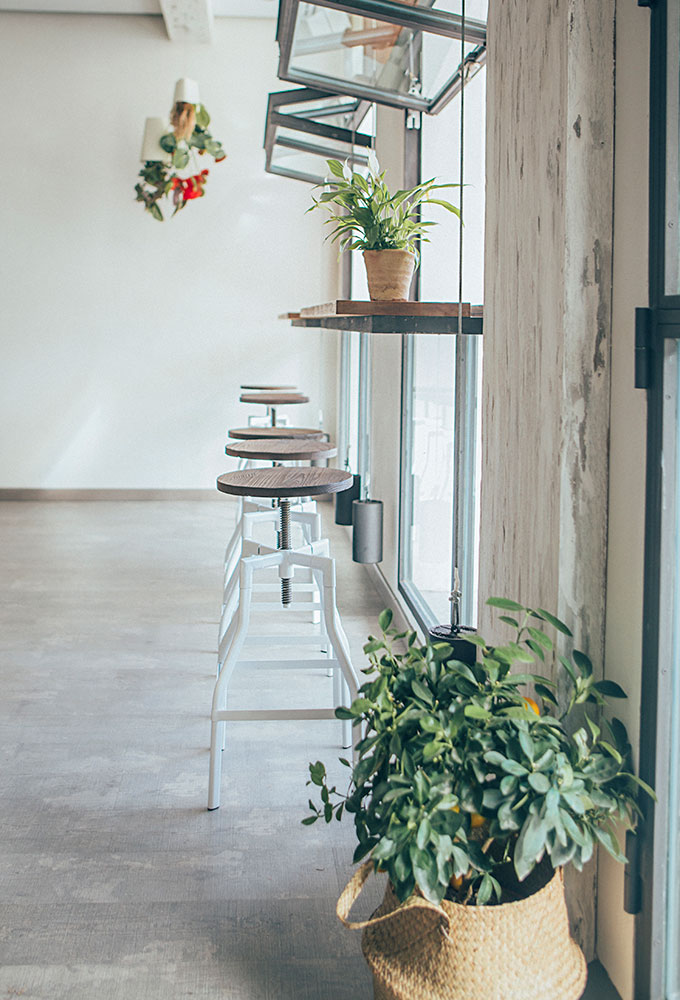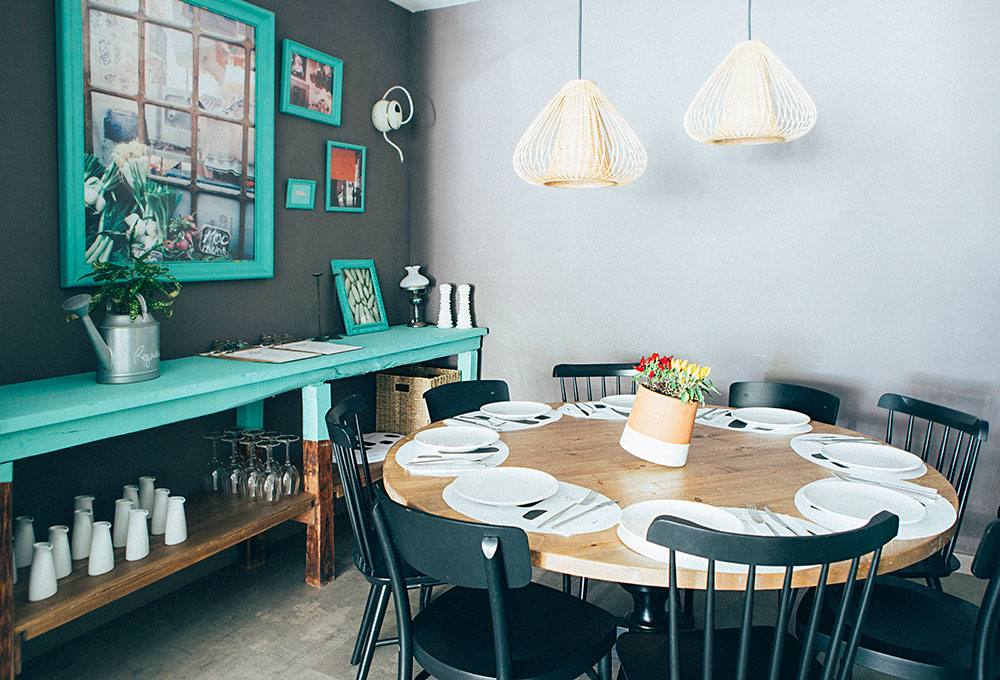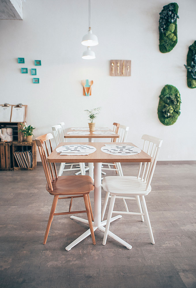 Après un petit escalier, nous entrons dans un établissement très agréable, des plantes suspendues et des petits détails déco tels que des arrosoirs (regadera en espagnol) qui sont le leitmotiv du restaurant. L’ensemble donne au lieu un aspect presque rural, influencé par les murs blancs, les plafonds, les volets, et ces touches de gris, de rouge et surtout de vert émeraude récurrent. L’endroit est très lumineux la journée, et devient plus intime à l’heure du dîner.