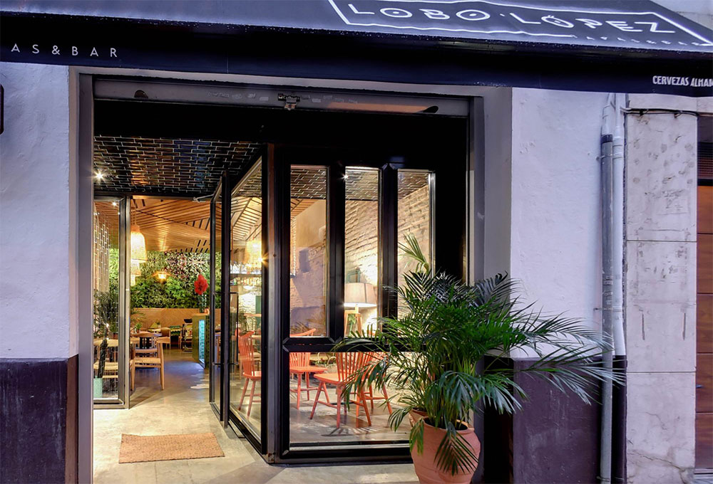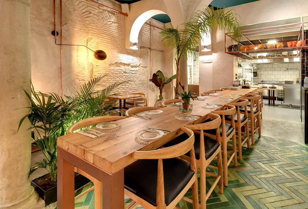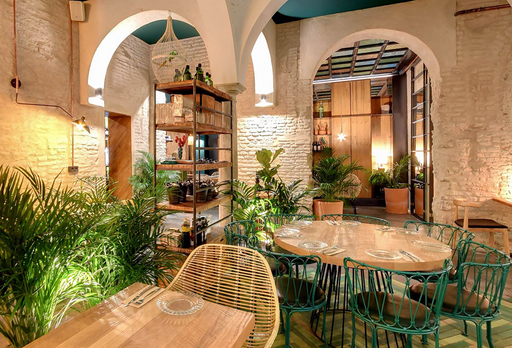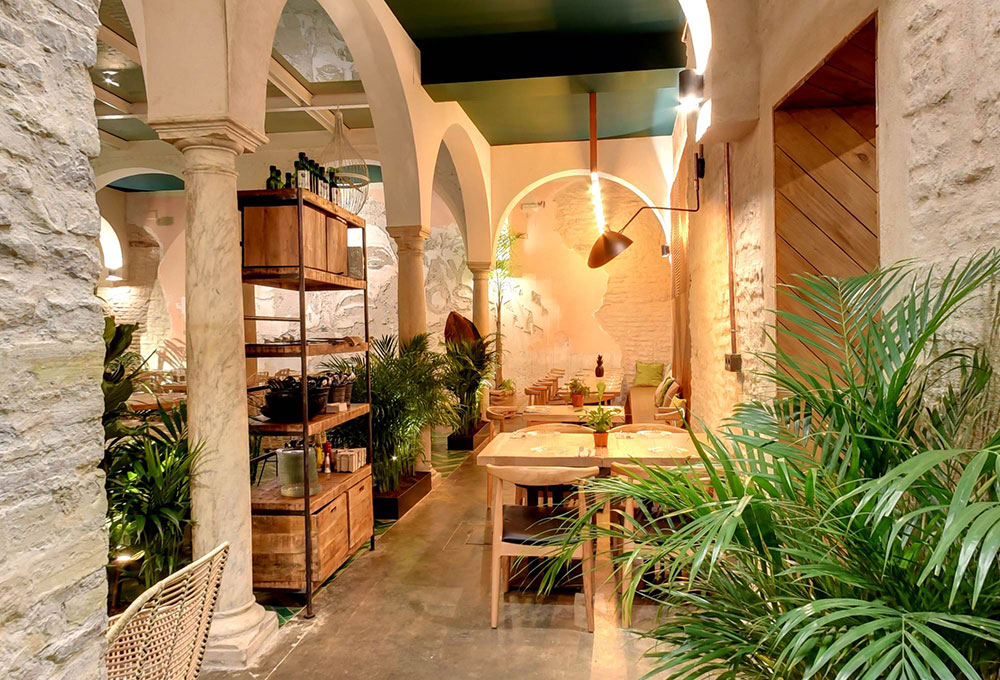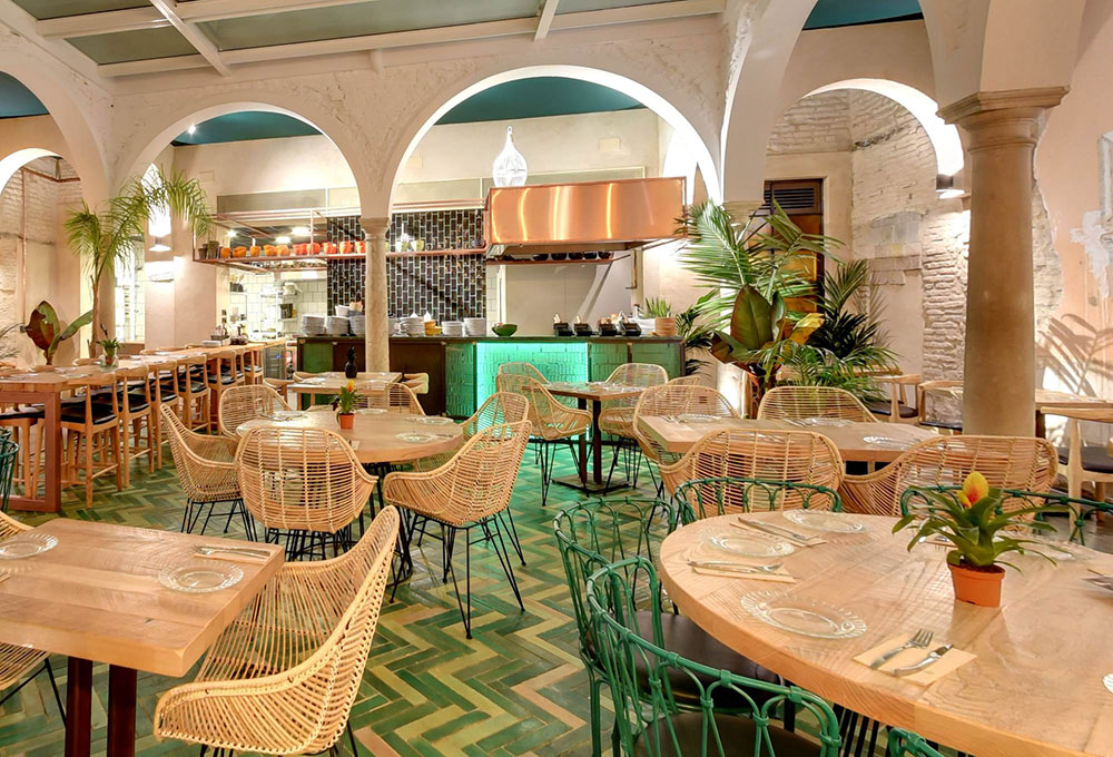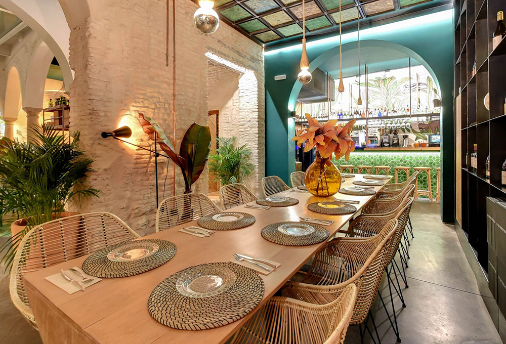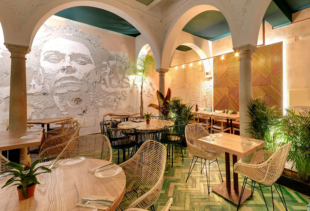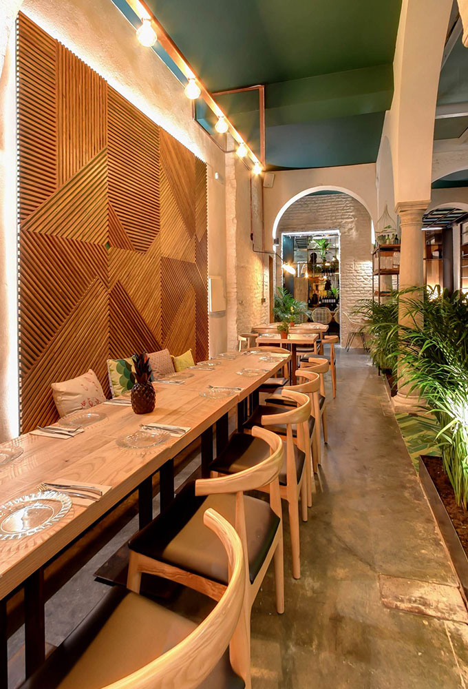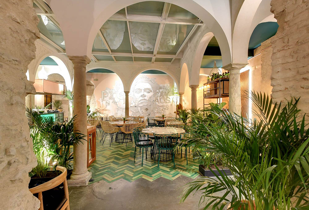C’est donc un espace totalement neuf qui a vu le jour en plein coeur de la capitale andalouse réalisé par les architectes d’intérieur de CM4, coiffé d’un plafond décoré de formes couleur terre et verte, un jardin vertical et de la végétation partout qui lui donne un aspect rustique mêlé avec des détails modernes, et un spectaculaire patio dans le pur style sévillan surplombé d’arcs qui en font le coeur de la salle. Une sorte d’oasis perdu au coeur de la ville dans lequel l’eau coule et la végétation fleurit. L’artiste lisboète Whils a été sollicité pour réaliser la sculpture du visage d’une femme, taillée directement au ciseau dans le mur du fond du patio principal. La salle comporte une table commune géante à sections triangulaires fabriquée sur mesure dans les ateliers de MisterWils.