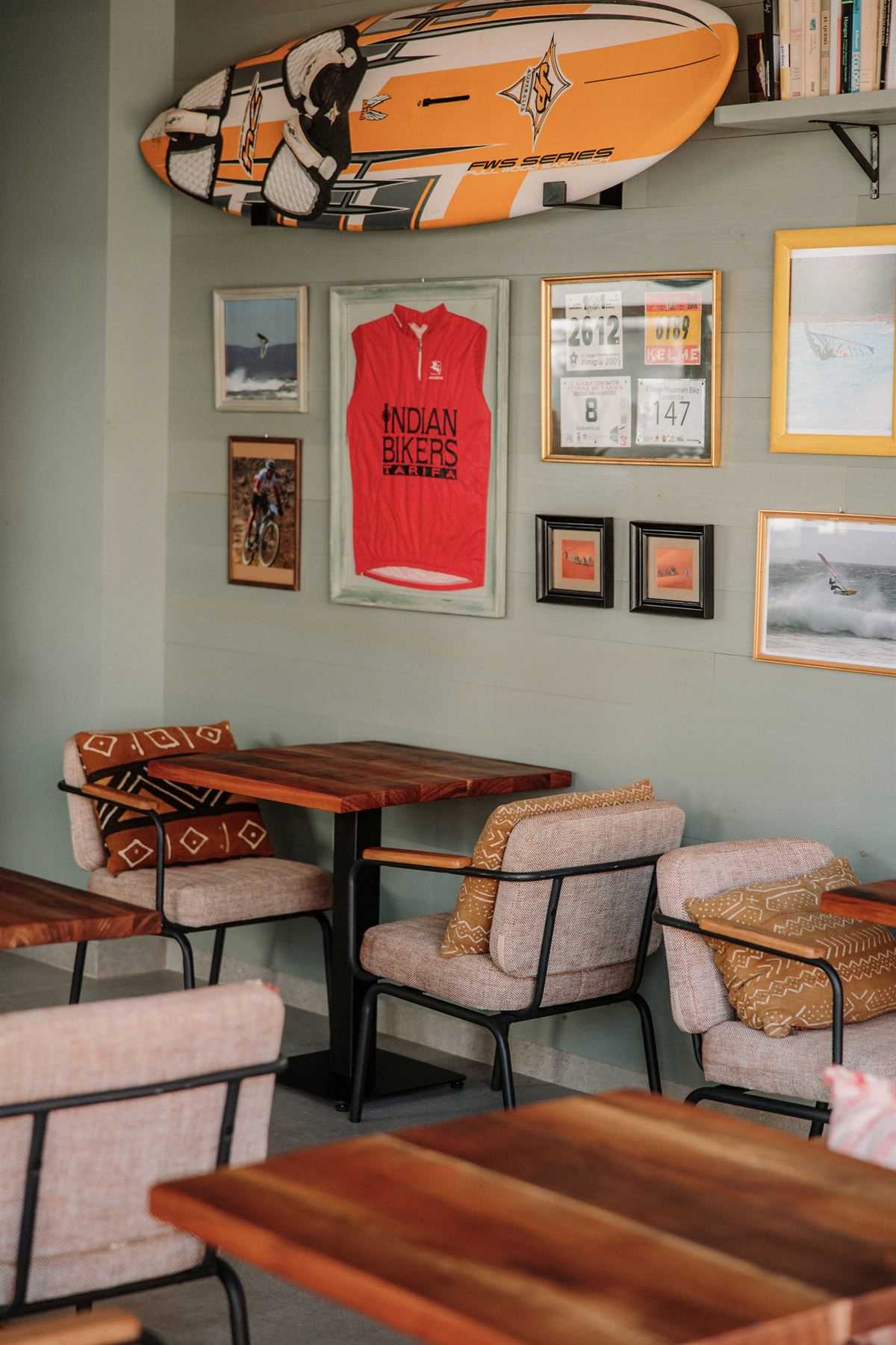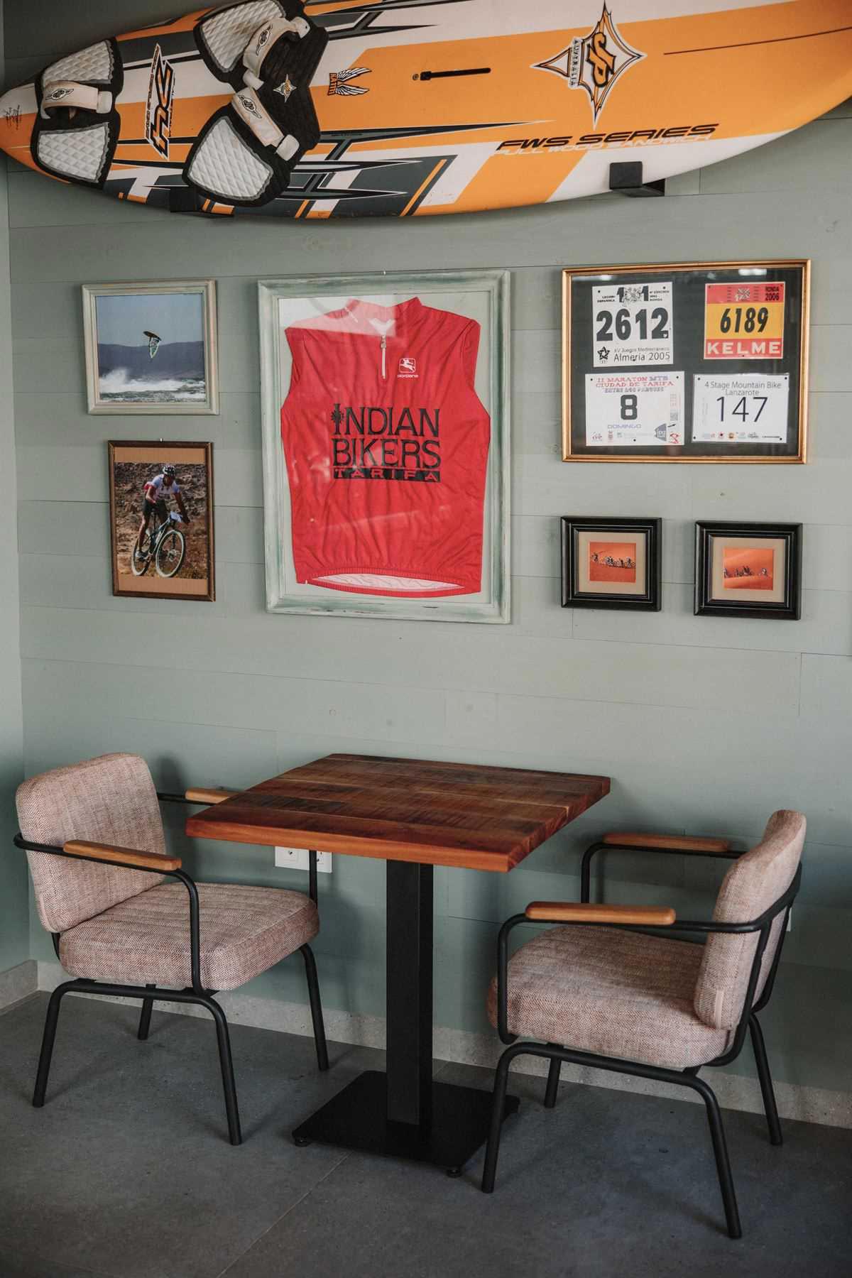 Par ailleurs, un peu partout dans l’établissement, nous pouvons trouver des affiches faites à la main et des objets sportifs ainsi que des photos comme éléments décoratifs.