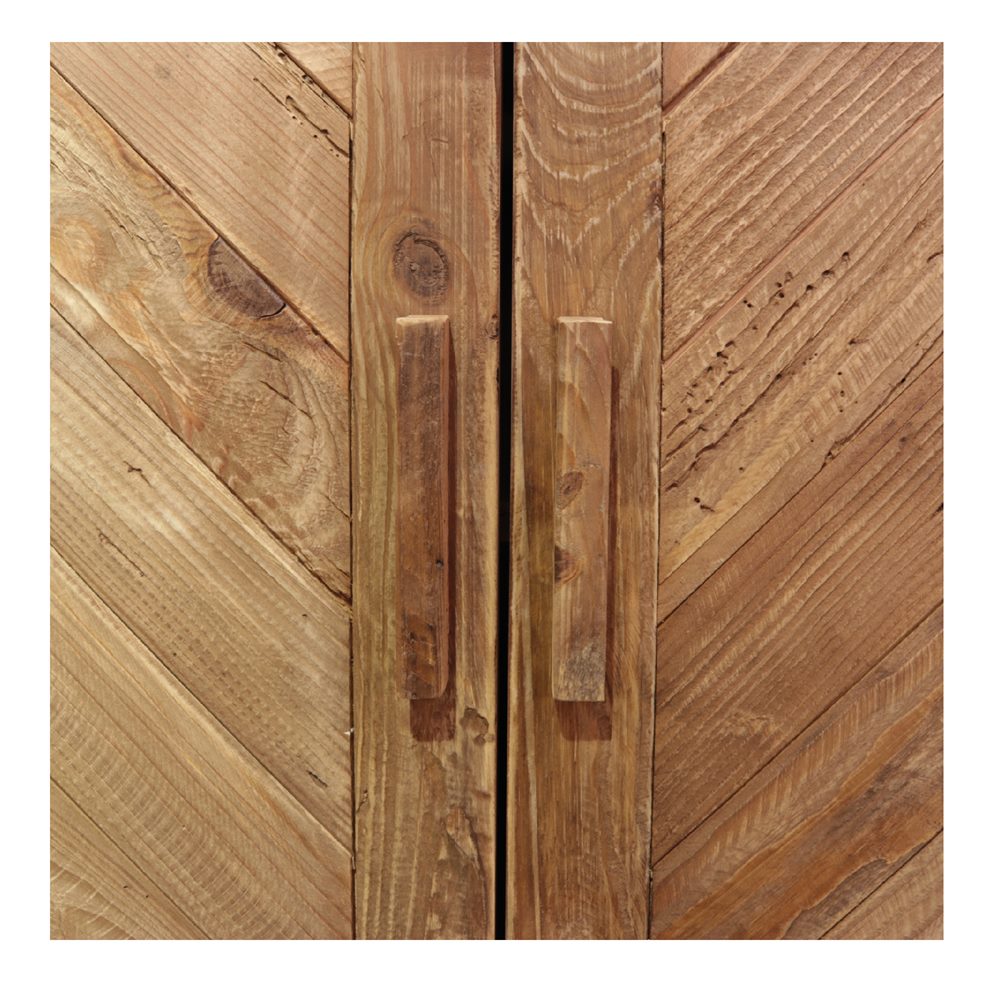 Buffet fabriqué en bois de pin recyclé avec deux portes battantes au design géométrique en épi.