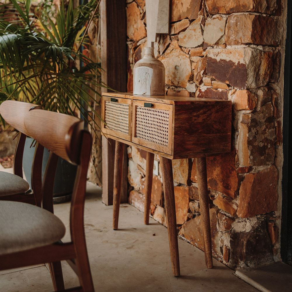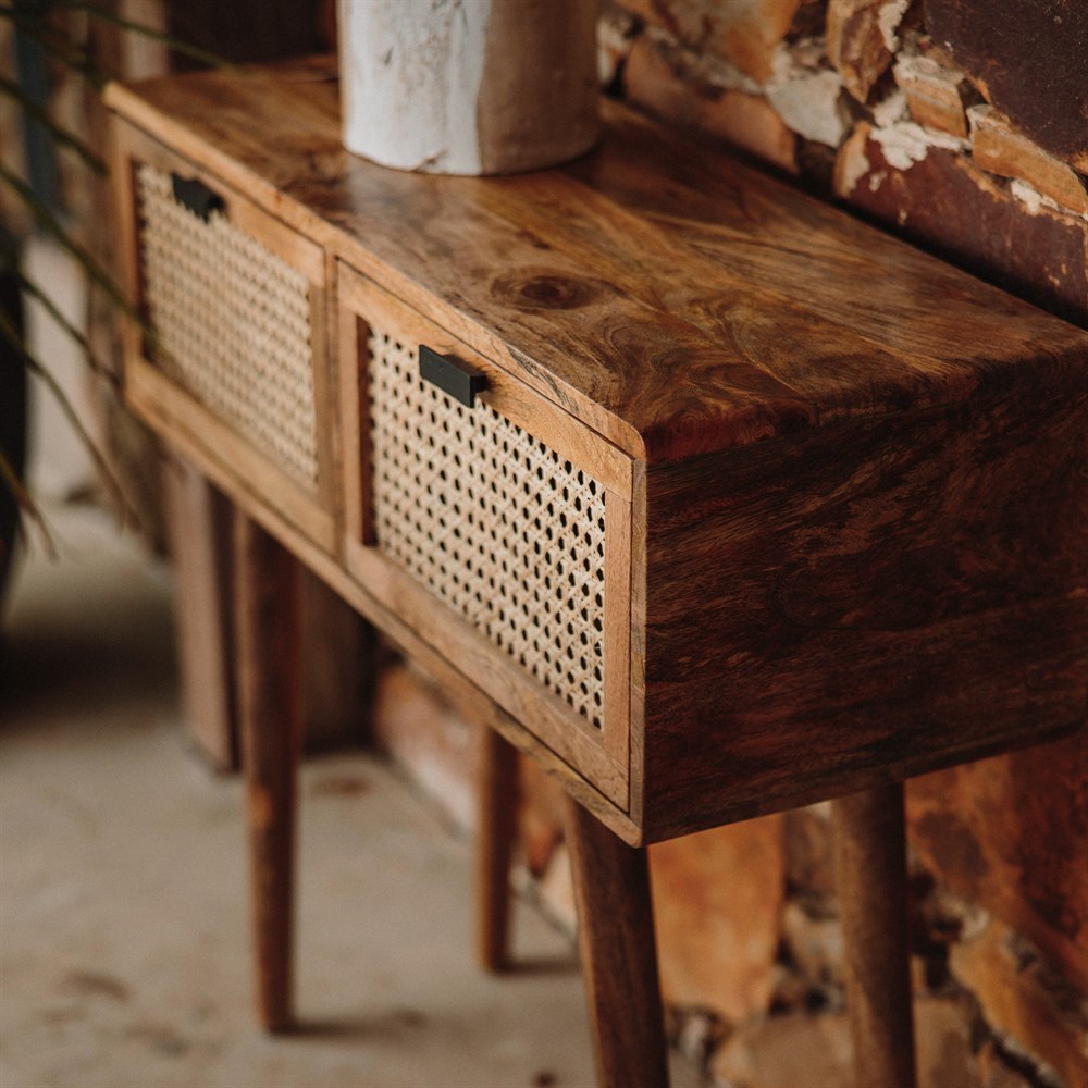 Élégante et tendance, cette console en bois et rotin modèle Surbeanie a tout pour plaire ! Dans une pièce de vie au look exotique, bord de mer chic ou plus minimaliste, elle ne manquera pas d’allure. Perchée sur des pieds en bois, cette console en bois et rotin s’offre une touche de modernité grâce à l’avant de ses tiroirs en cannage. Cette méthode de tressage s’invite sur les meubles et s’introduit facilement dans tous les types d’intérieur. Vous apprécierez les larges tiroirs de cette console qui vous offriront la possibilité de ranger votre linge de lit, de maison ou vos vêtements. Bois, cannage en rotin, espaces de rangement généreux : une console en bois et rotin qui a tout bon !