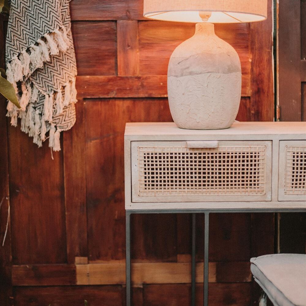 Plateau en bois de manguier massif et maille de jonc, type cannage.