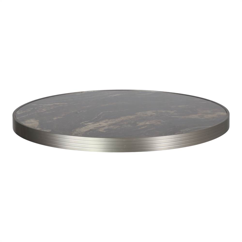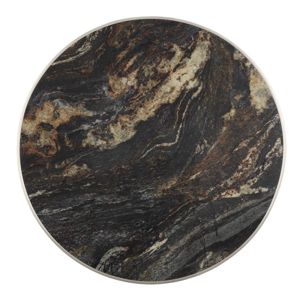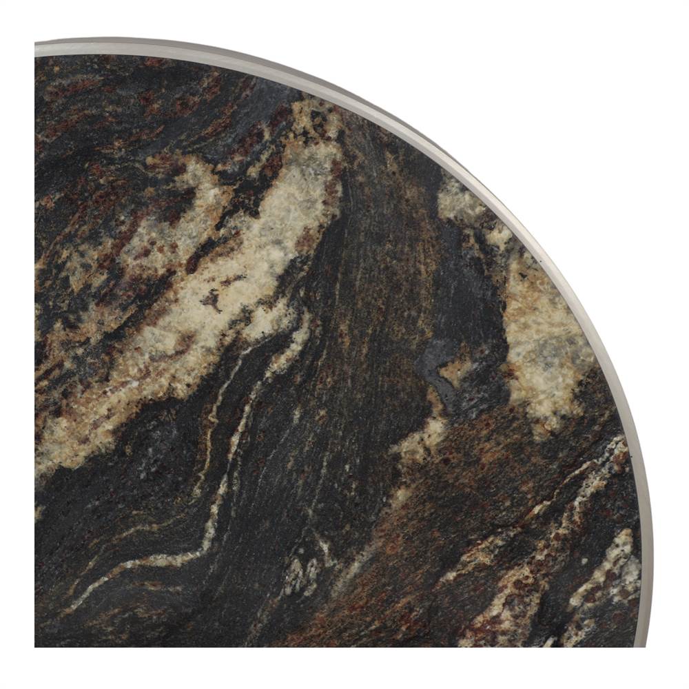 Plateau de table en contreplaqué stratifié avec placage laminé en finition Blue Storm, cadre en aluminium finition cuivre mat anodisé. Épaisseur de 2,5 cm.