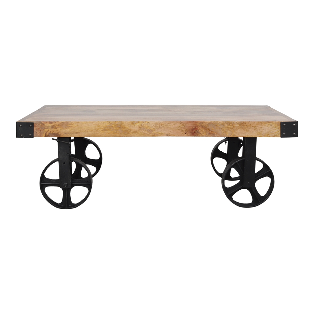 Montée sur de grosses roues en métal vieilli, cette table basse en bois apportera une note authentique à votre salon.