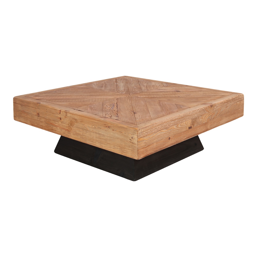 Table basse fabriquée en bois de pin recyclé. Base en bois de forme pyramidale, peinte en noir.