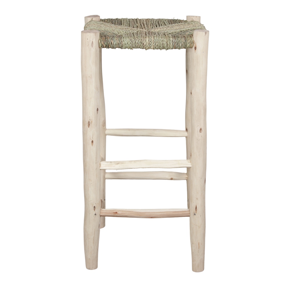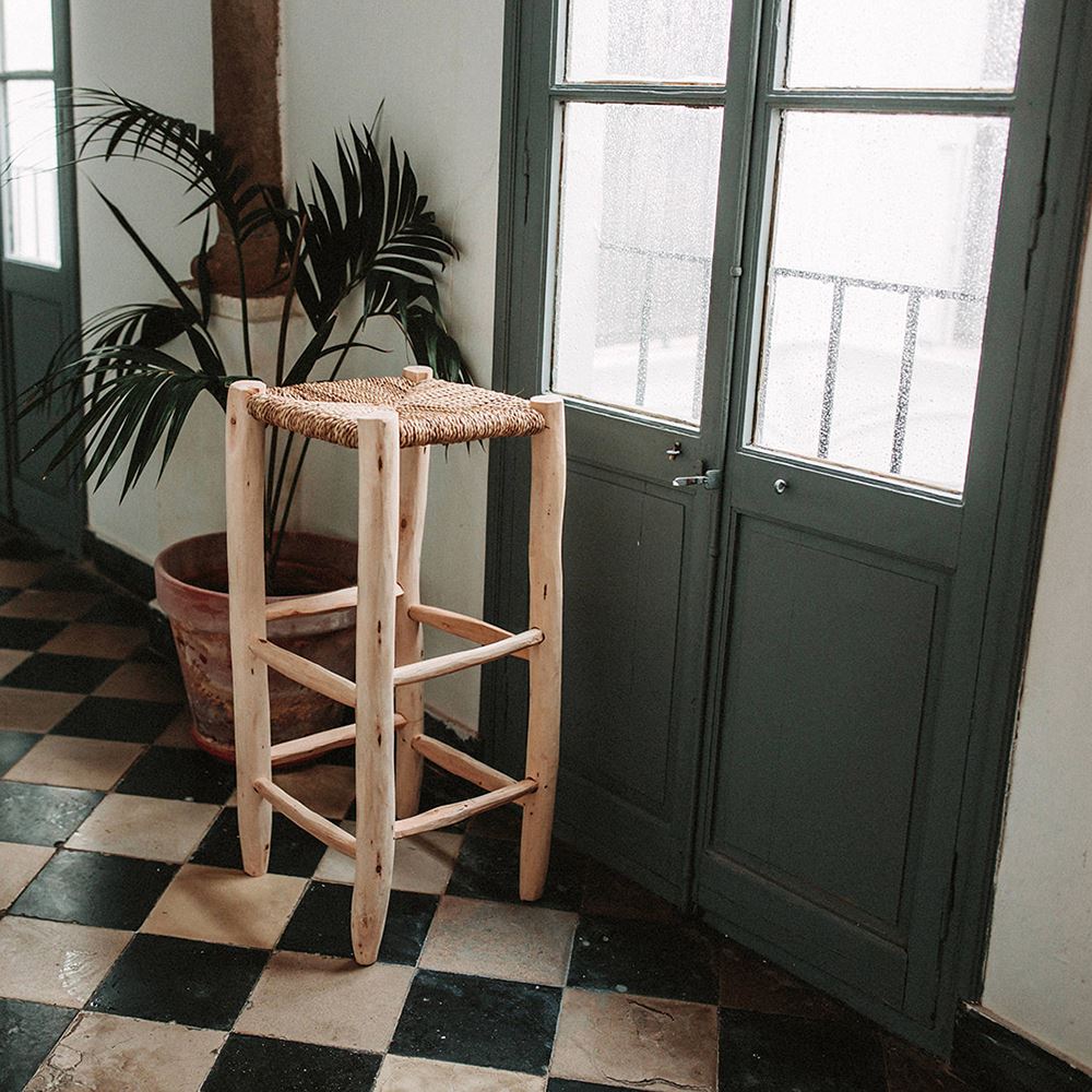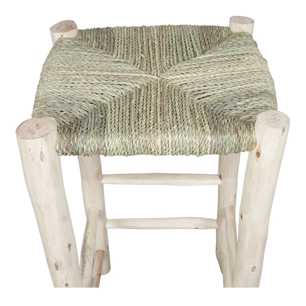 Tabouret haut de style vintage shabby chic, structure en bois de laurier, assise en feuilles de palmier naturelles.