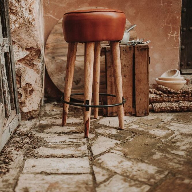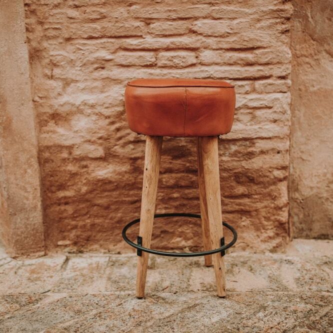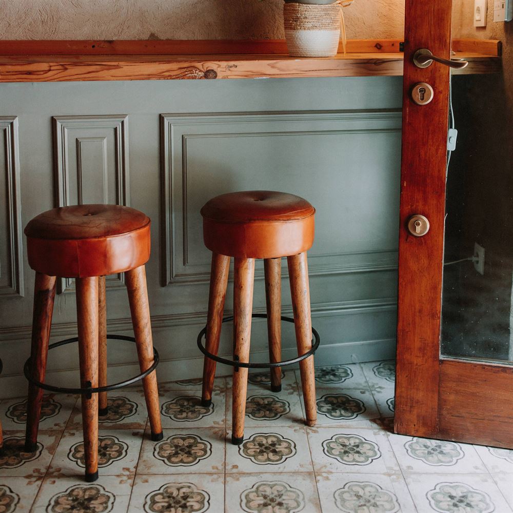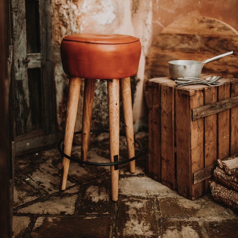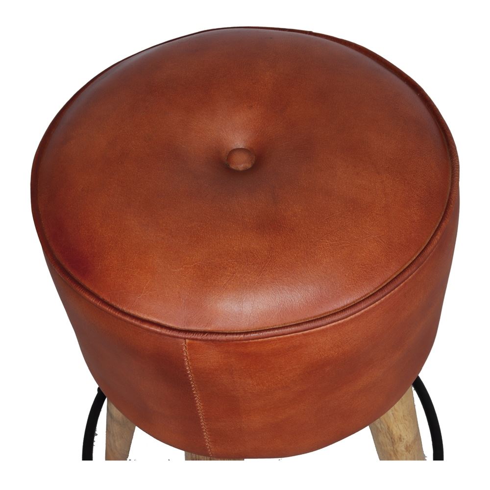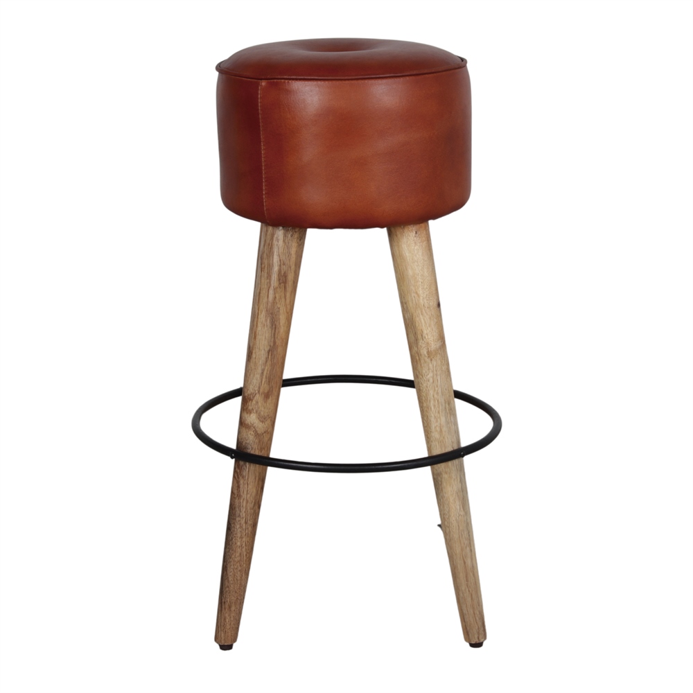 Tabouret haut en cuir et en bois Colt, de style industriel et vintage.