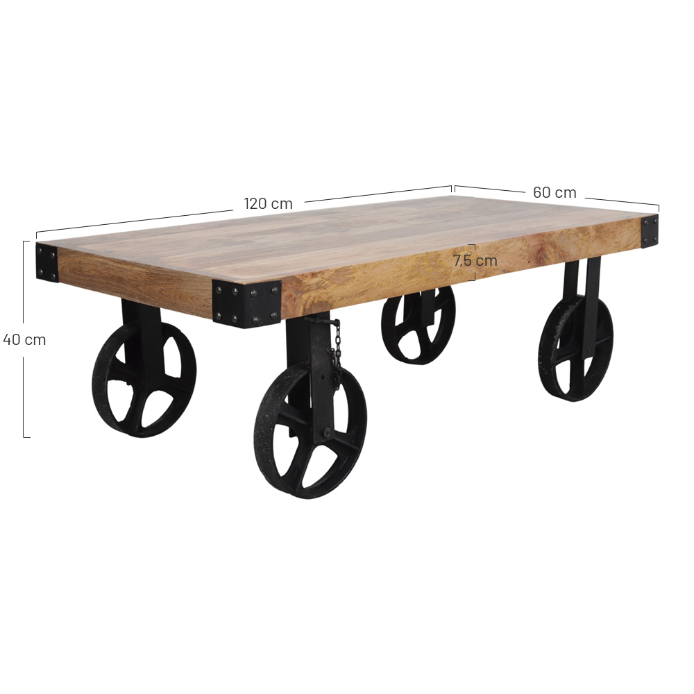 Montée sur de grosses roues en métal vieilli, cette table basse en bois apportera une note authentique à votre salon.
