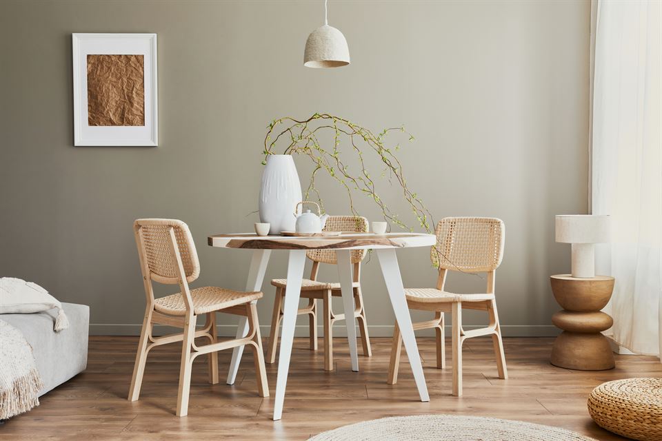 En général, la clé pour travailler le vert olive ou le vert eucalyptus en décoration est d’expérimenter et de trouver la combinaison qui correspond le mieux à vos préférences personnelles et au style général de votre maison. La polyvalence de ces couleurs permet un large éventail de possibilités pour créer des espaces uniques et harmonieux, et les tons terre et naturels sont également une réussite pour les deux couleurs. Les meubles en rotin ou en bambou sont parfaits pour cette combinaison, par exemple la lampe en rotin Kooper, qui existe en deux tailles, maxi ou mini, selon l’espace et la hauteur sous plafond de la pièce à décorer.